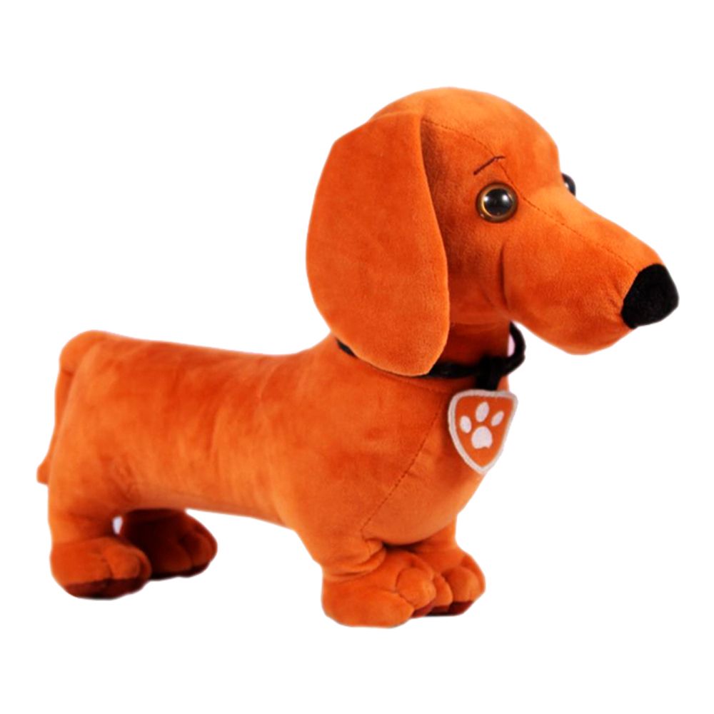 Милая мягкая игрушка в виде забавного щенка. Вокруг шеи у собачки повязан ошейник с фетровым значком. Размер игрушки 40х26х11 см. Приятная на ощупь, выполнена из безопасных материалов.