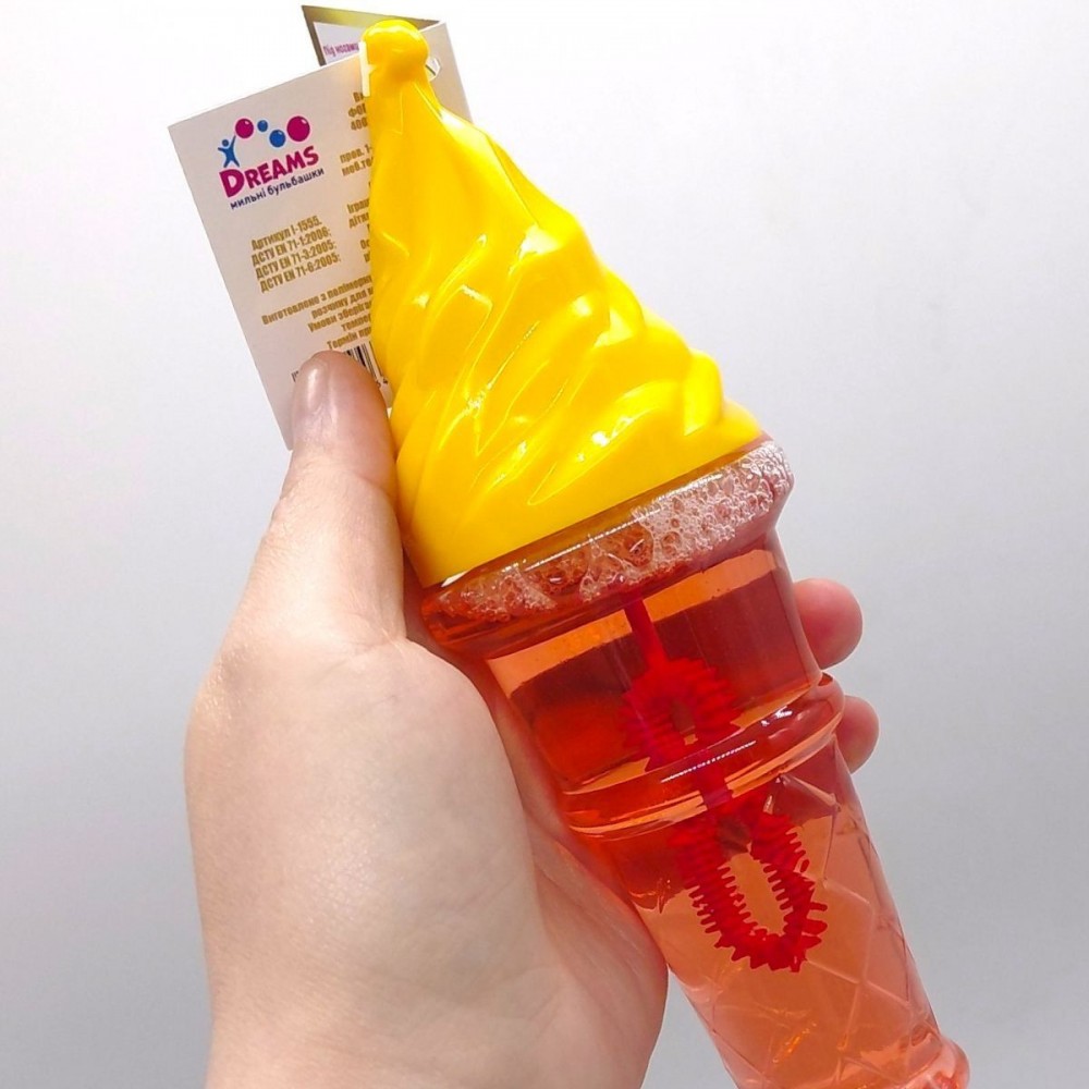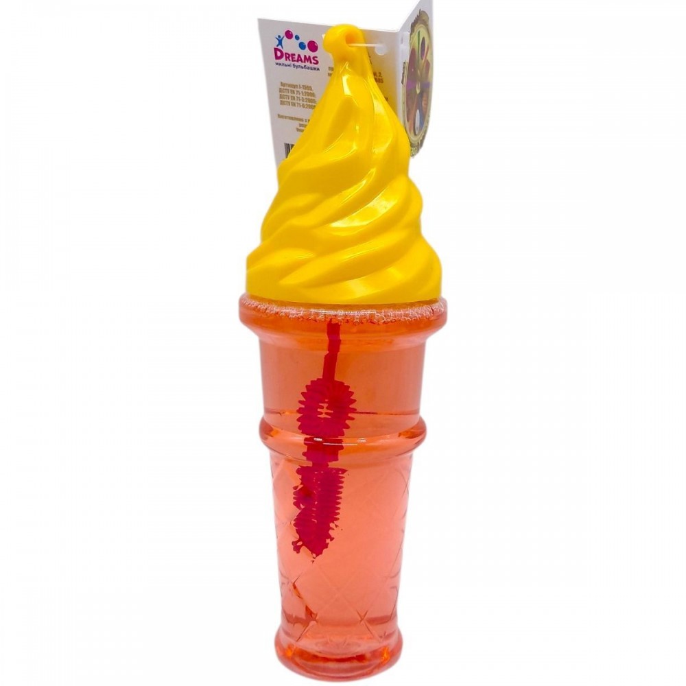 Мыльные пузыри в форме мороженого с приятным ароматом. Бутылочка на 150 мл, рамка из 2-х секций. Размер бутылочки: 18х6 см.