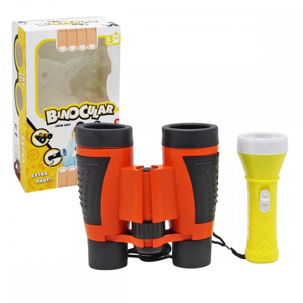 Детский игровой набор включает в себя: бинокль и фонарик. Бинокль приближает в несколько раз, имеет удобную веревочку с помощью которой его легко можно повесить на шею. Фонарик имеет яркий свет. Комплект изготовлен из прочного нетоксичного пластика.