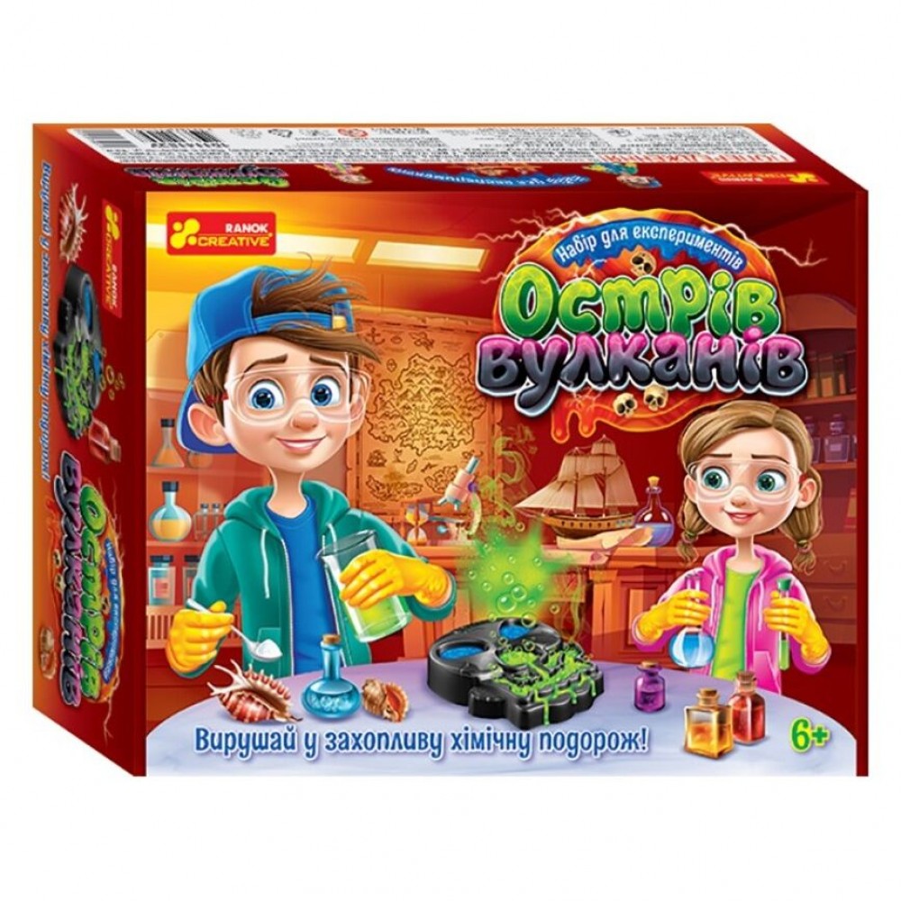 Привет, затейник! Наверное, тебе уже не терпится отправиться в химическое путешествие на остров вулканов. Наберись терпения! Остров в виде черепа – это настоящее химическое чудо на твоем столе. Бурлит, булькает разноцветная лава. Тебе остается только наблюдать и наслаждаться чудом! Для детей от 6 лет.