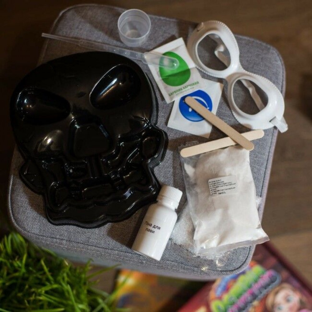 Пищевые красители (зеленый, синий), ластиковый остров "Череп", палочки для перемешивания, пипетка Пастера, стаканчики, мерный стакан, гидрокарбонат натрия, лимонная кислота, ложка, пена для скамьи, защитные перчатки, защитные очки, пошаговая.