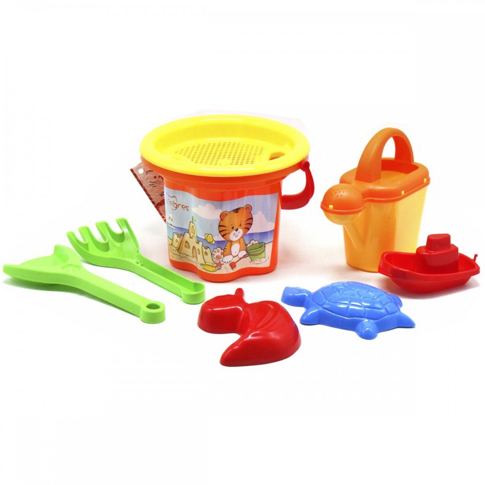 Набор для игры с песком будет замечательным подарком для малыша. В комплекте есть: ведерко, лопатка, ситечко, грабли, 2 формочки для песка, лейка и кораблик. Размер ведра 14х20х20 см. Выполнено из качественных и безопасных материалов. Для детей от года.