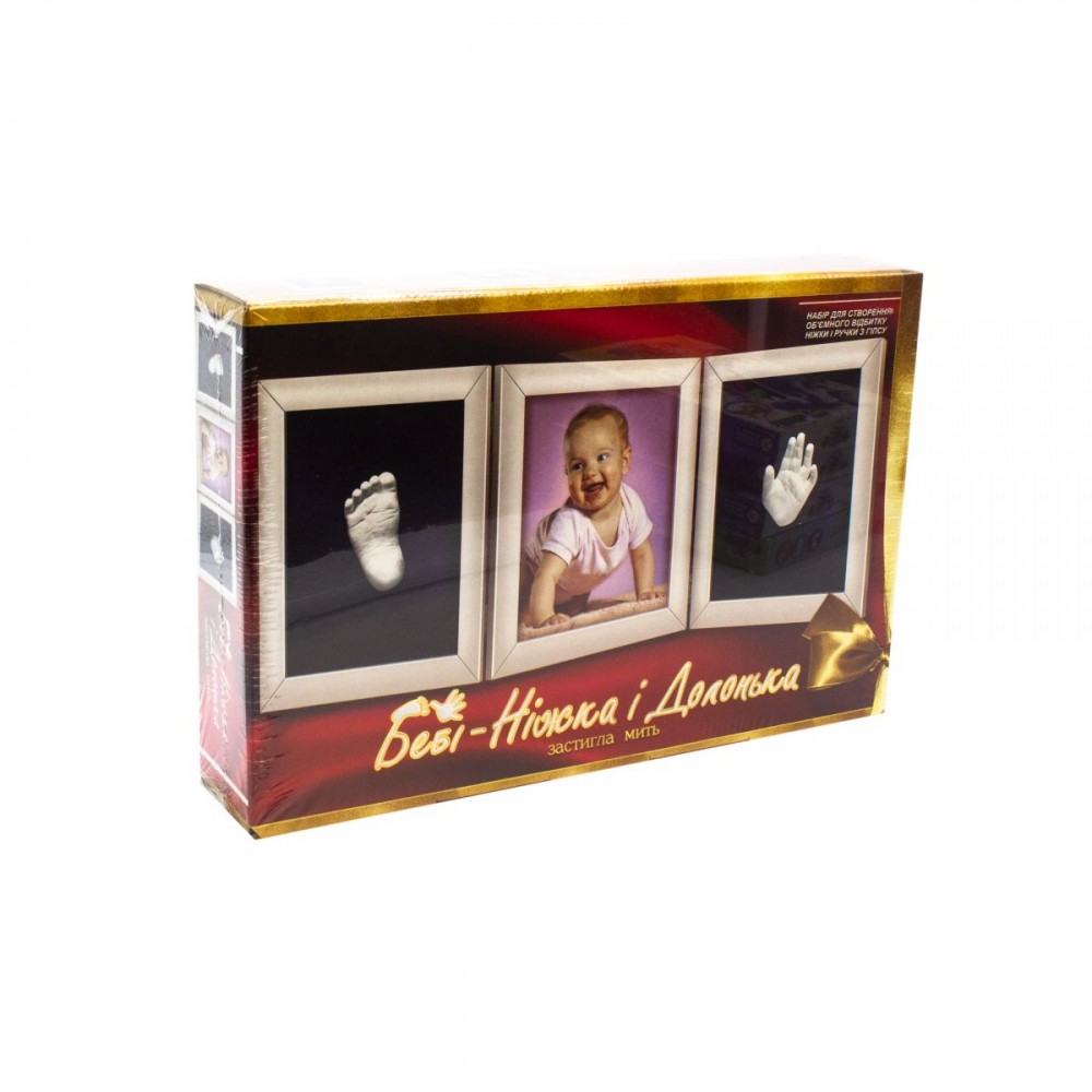 Набор для творчества "Бэби-Ножка и Ладошка". Вы легко сможете создать уникальную семейную ценность, которая позволить сохранить неповторимые мгновения детства Вашего малыша. В комплекте: моделирующий гель, порошковый гипс, контейнер-форма для отпечатка ладошки, тройная багетная рамка (18 х 13 см), паспарту, крепежная проволока.
