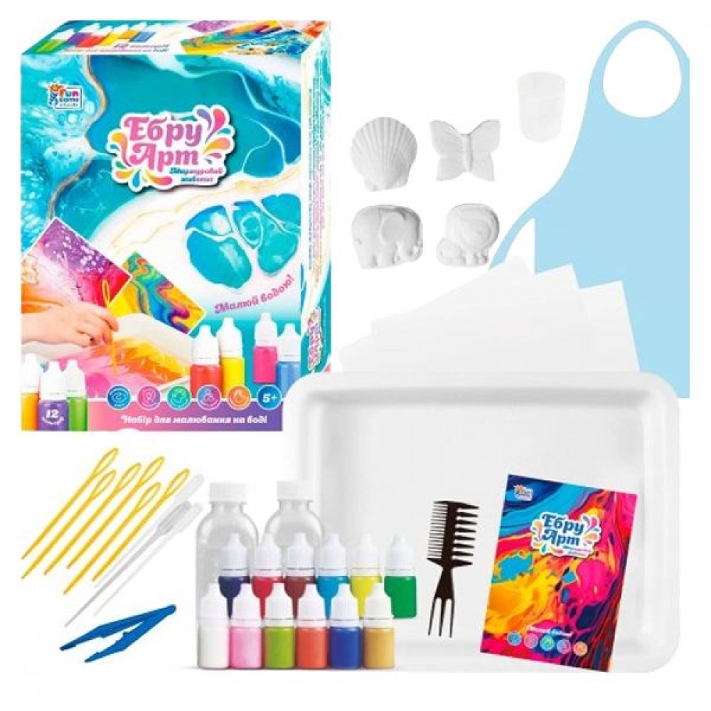 Эбру – это метод водного дизайна поверхности, который может создавать узоры, похожие на дымчатый мрамор или другие виды камня. Узоры являются результатом взаимодействия цветов, которые затем осторожно переносят на поверхность подготовленного полотна. Особенностью техники является то, что каждый рисунок уникален и неповторим, благодаря чему имеет ценность для каждого автора. В данном наборе для творчества есть: 12 бутылочек с красками-пигментами разных оттенков, бумага, емкость для рисования, пипетка, пинцет, пластиковый стержень-шило, гипсовые фигурки, мерная чашка, бутылка 250 мл + коцентрат для рисования, расческа для рисования, фартук.