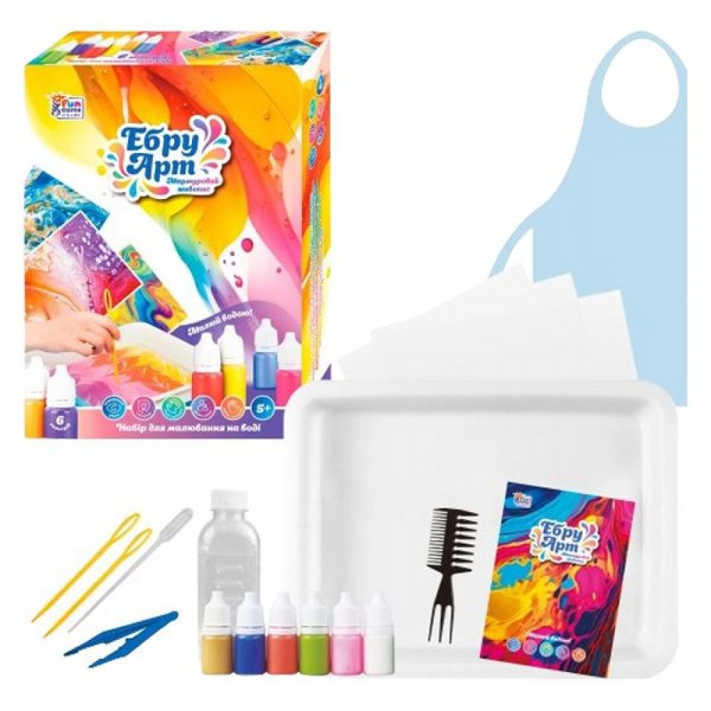 Эбру – это метод водного дизайна поверхности, который может создавать узоры, похожие на дымчатый мрамор или другие виды камня. Узоры являются результатом взаимодействия цветов, которые затем осторожно переносят на поверхность подготовленного полотна. Особенностью техники является то, что каждый рисунок уникален и неповторим, благодаря чему имеет ценность для каждого автора. В данном наборе для творчества есть: 6 бутылочек с красками-пигментами разных оттенков, бумага, емкость для рисования, пипетка, пинцет, пластиковый стержень-шило, бутылка 250 мл, расческа для рисования, фартук..