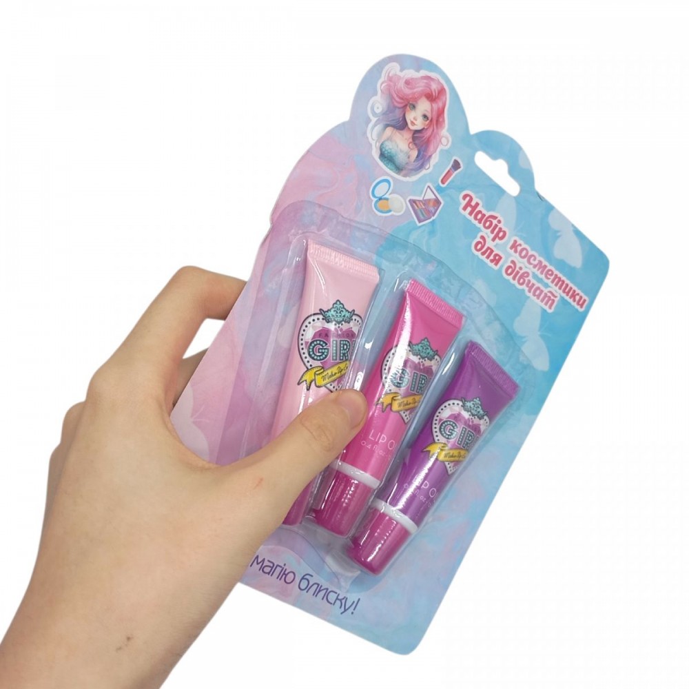 Набор деской косметики будет хорошим подарком для юной леди. В наборе есть 3 блеска для губ. Выполнен набор из качественных и безопасных материалов. Для детей от 3-х лет._