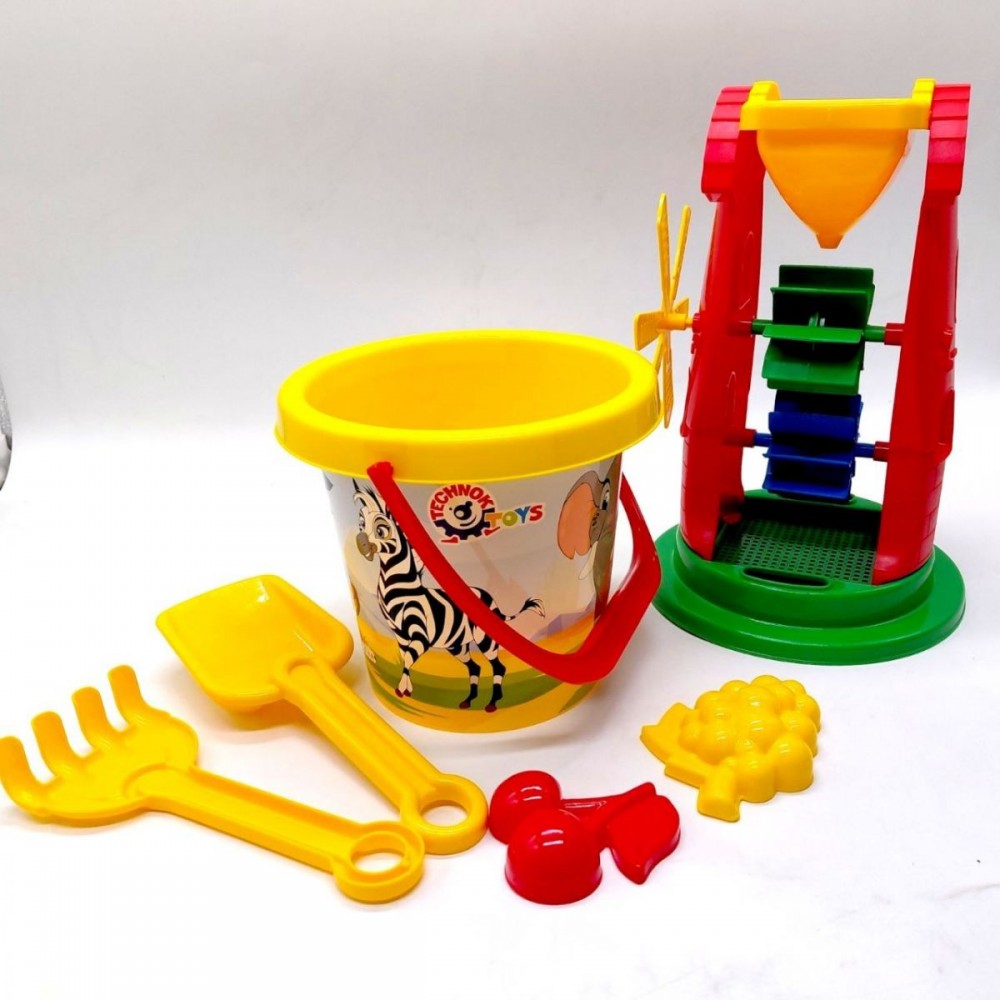 Песочный набор "Технок" - универсальный комплект для активных игр на улице и у воды. В состав входит ведерко, водяная мельница, лопатка, грабельки, сито и формочки, позволяющие создавать разные фигуры и конструкции из песка. Изготовлен из прочного пластика, безопасен для детей и удобен в использовании. Игрушка способствует развитию воображения, мелкой моторики и координации. Подходит для игры на пляже, во дворе или в песочнице.