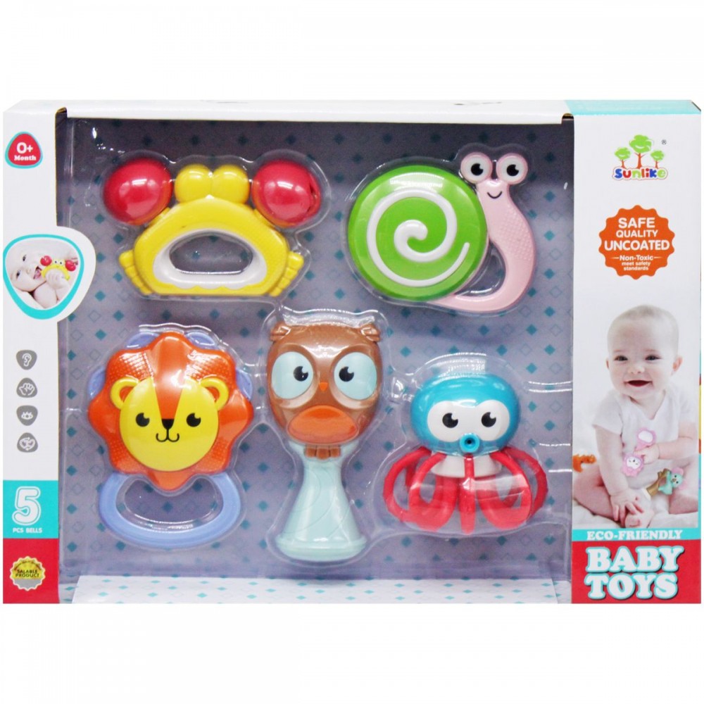 Набор ярких погремушек для малышей. В комплекте есть 5 погремушек в виде милых зверушек, на каждой игрушке есть привлекающие внимание ребенка развивающие элементы - гремелки, прорезыватели, шуршалки. Все элементы набора выполнены из качественных и абсолютно безопасных для ребенка материалов. Для детей от 0 месяцев.