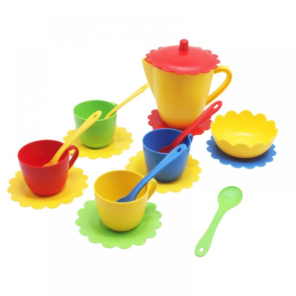 Пластиковый набор посуды из 19 предметов. В комплекте: чайничек с крышечкой, сахарница с крышечкой, 4 чашечки, 6 блюдечек и 5 чайных ложечек. Для детей от года. _