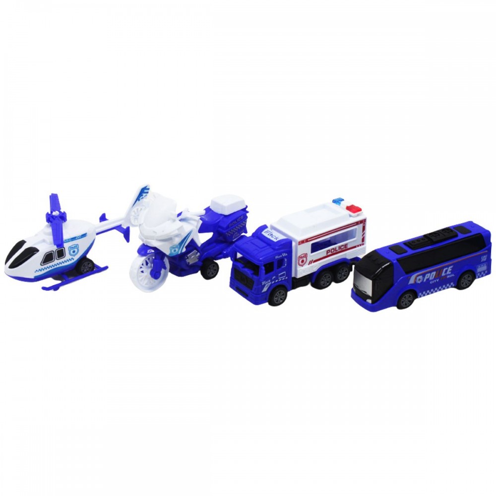 Набор пластиковых машинок из серии "Полицейская служба". В комплект входит: автобус, грузовик, вертолет и мотоцикл. Транспорт инерционный. Размер машинок от 11 до 14 см.
