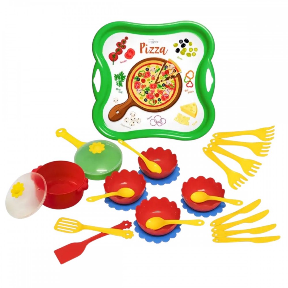 Набор детской посудки на подносе с ярким, "аппетитным" принтом. В комплекте: поднос (29 х 29 см), 4 мисочки (d=9 см), 4 тарелочки (d=12 см), 4 ложки, 4 вилки, 4 ножа, 2 лопатки, кастрюля и сковородка с крышечкой. Предназначен для детей возрастом от 12 месяцев. _