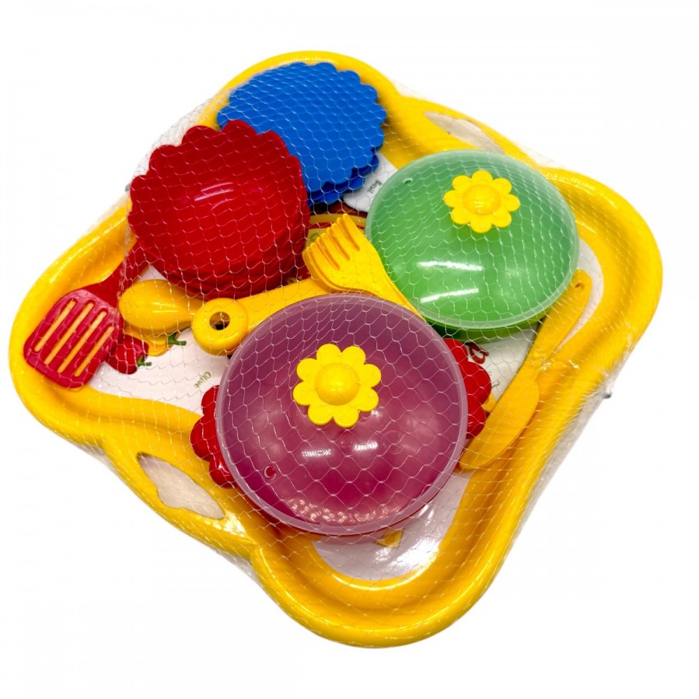 Поднос, 4 мисочки, 4 тарелочки, 4 ложки, 4 вилки, 4 ножа, 2 лопатки, кастрюля и сковородка с крышечкой