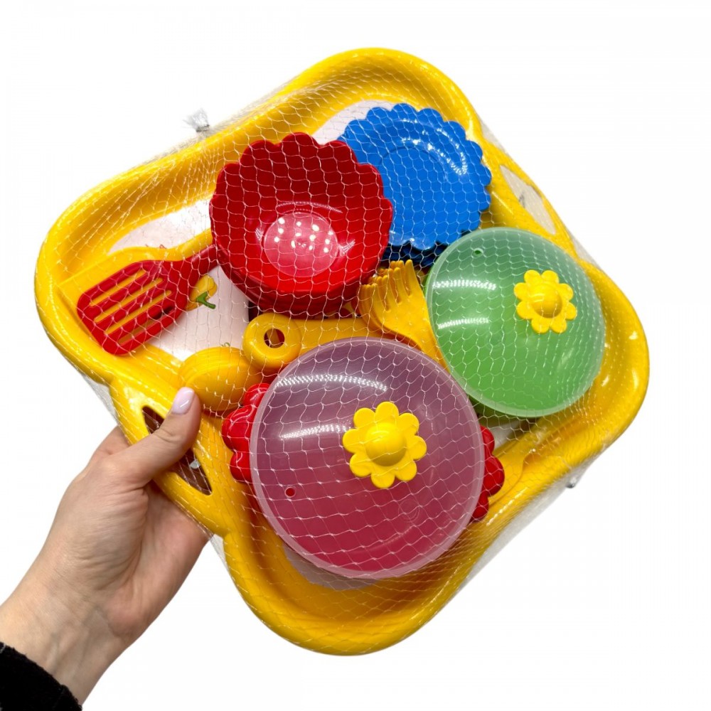 Набор детской посудки на подносе с ярким, "аппетитным" принтом. В комплекте: поднос (29 х 29 см), 4 мисочки (d=9 см), 4 тарелочки (d=12 см), 4 ложки, 4 вилки, 4 ножа, 2 лопатки, кастрюля и сковородка с крышечкой. Предназначен для детей возрастом от 12 месяцев. _