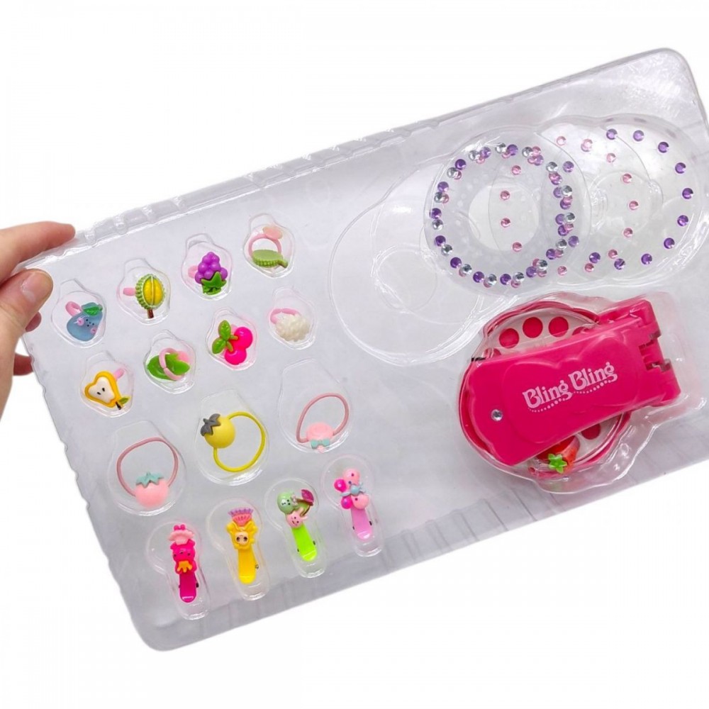 Инструмент для декорирования – 1 шт. Пластина или кассета со стразами – 1 шт. Набор декоративных украшений Резинки для волос (набор) Упаковка – 1 шт.