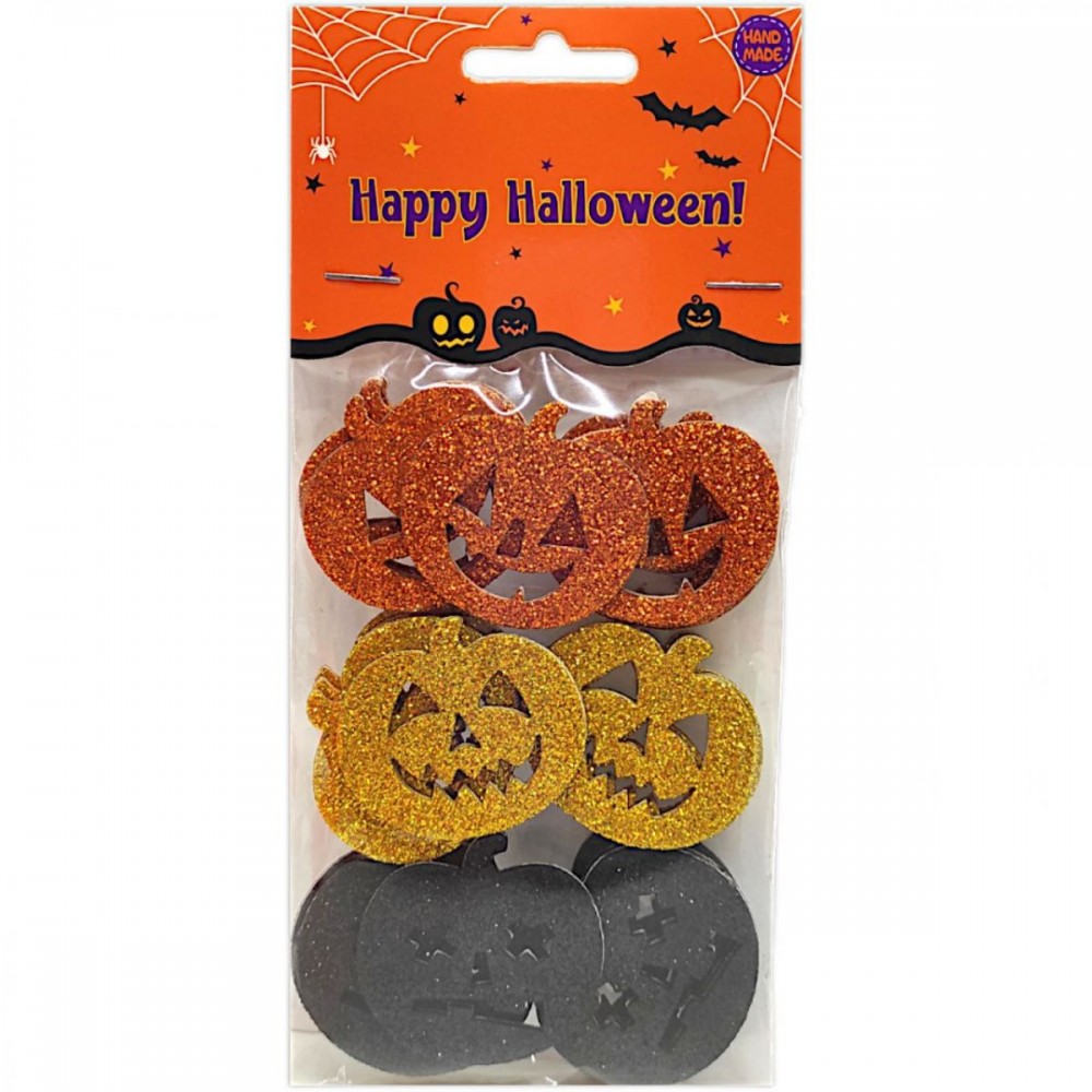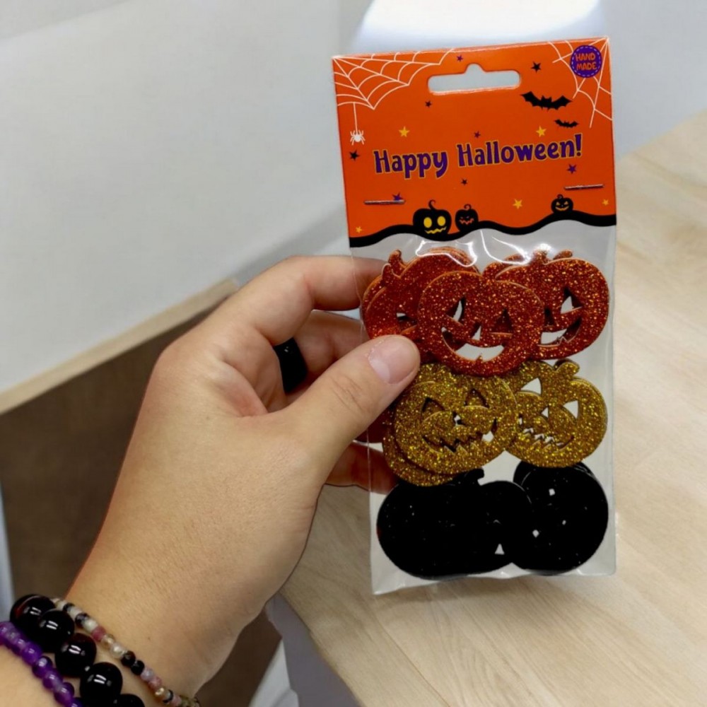 Набор декоративных наклейок из фоамирана "Хэллоуин (Halloween)" от украинского бренда Апли Капли. Украшенные блестками, они прекрасно впишутся в праздничный интерьер и создадут атмосферу. В наборе есть 20 наклейок с силуэтами тыкв. Размер 1 наклейки, примерно 4,5 см.