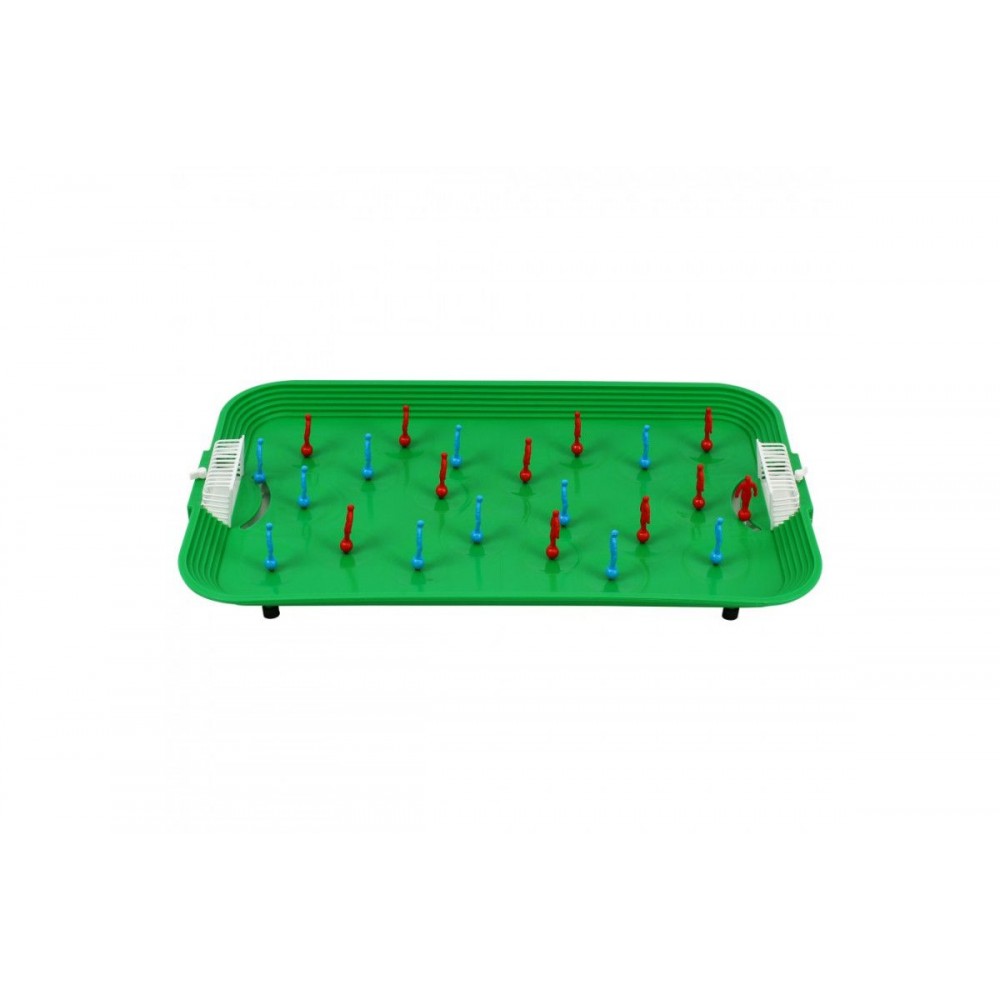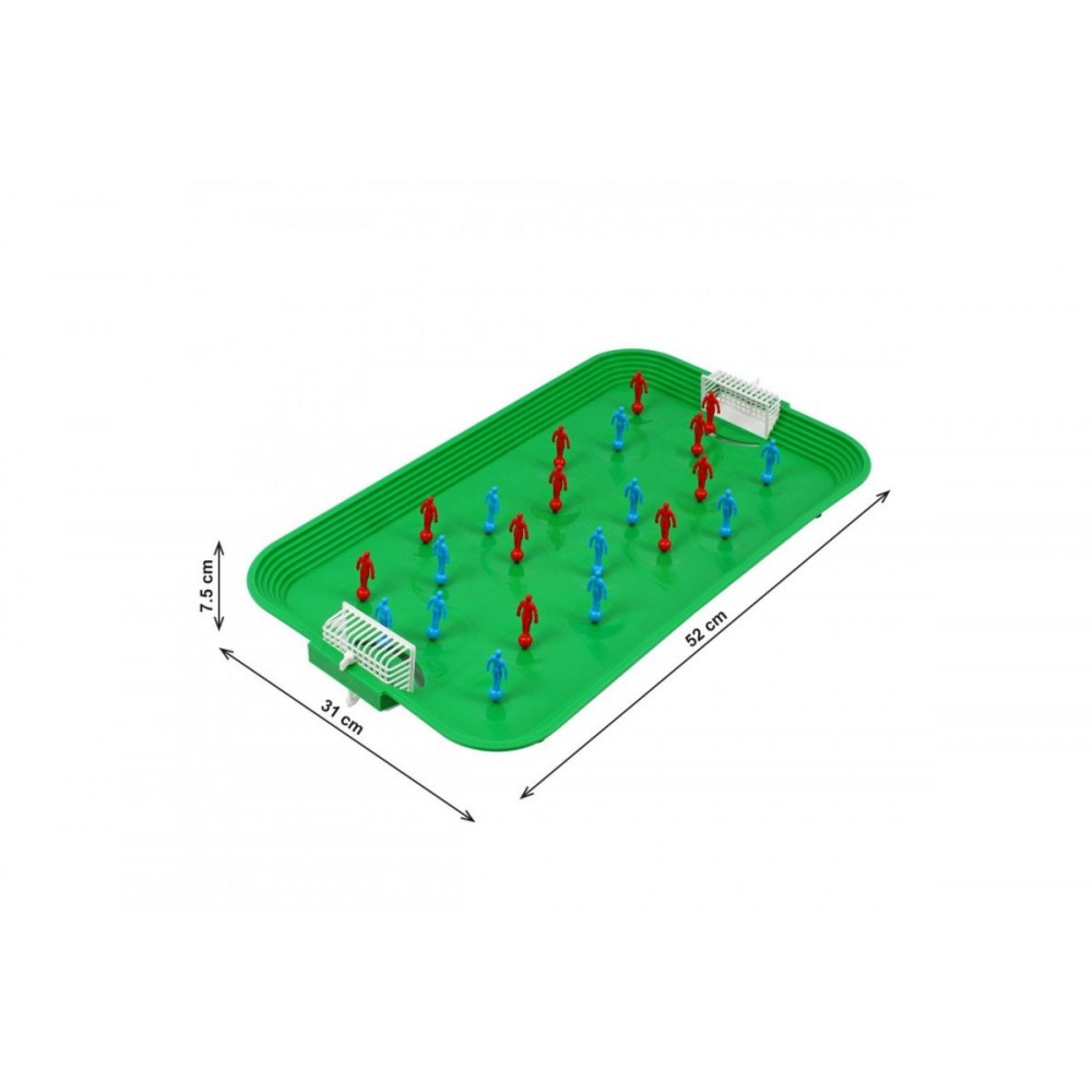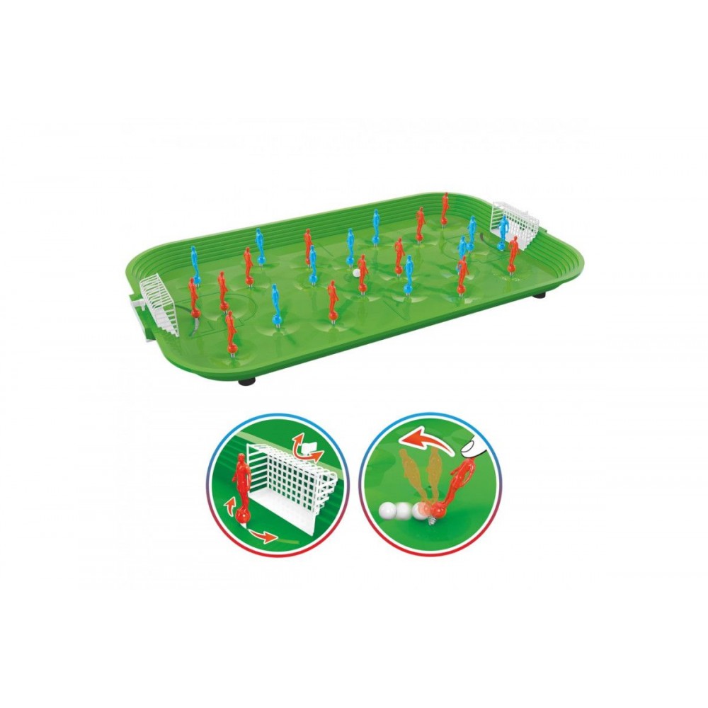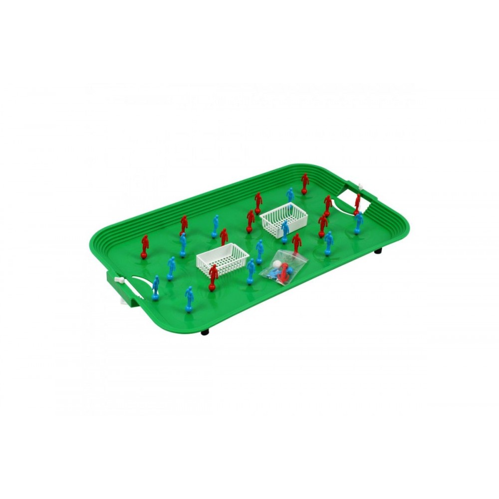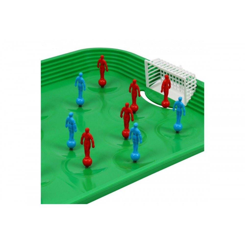 Настольная игра "Супер Футбол ТехноК". Комплект включает поле для игры, 2 команды (по 11 игроков) и запасных игроков. Пружинный механизм игры._