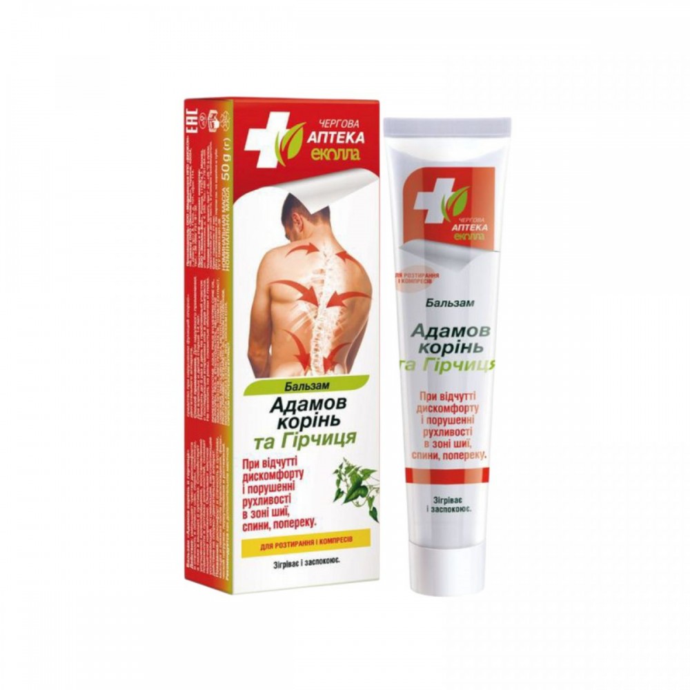 Симптомы физического перенапряжения, раздражения и отечности эффективно устранит бальзам "Адамов корень и горчица" от бренда Биокон Очередная Аптека Эколла. Средство уменьшит раздражение и снимет отечность кожи, улучшит кровообращение, сократит мышечное напряжение. Благодаря своему натуральному составу, бальзам улучшает подвижность в суставах и позвоночнике, действует согревающе и успокаивающе. В экстрактах Адамового корня содержатся гликозиды, дубильные вещества, сапонины, муравьиная и щавелевая кислота, благодаря чему бальзам благоприятно действует при воспалениях суставов, радикулитов, ревматизма и артрита. Экстракт горчицы богат фитонцидами, улучшает циркуляцию крови, снимает отеки и боли. Противовоспалительное действие оказывают эфирные масла пихты и сосны. Бальзам "Адамов корень и горчица" Очередная Аптека Эколла прекрасно согревает и улучшает кровообращение.