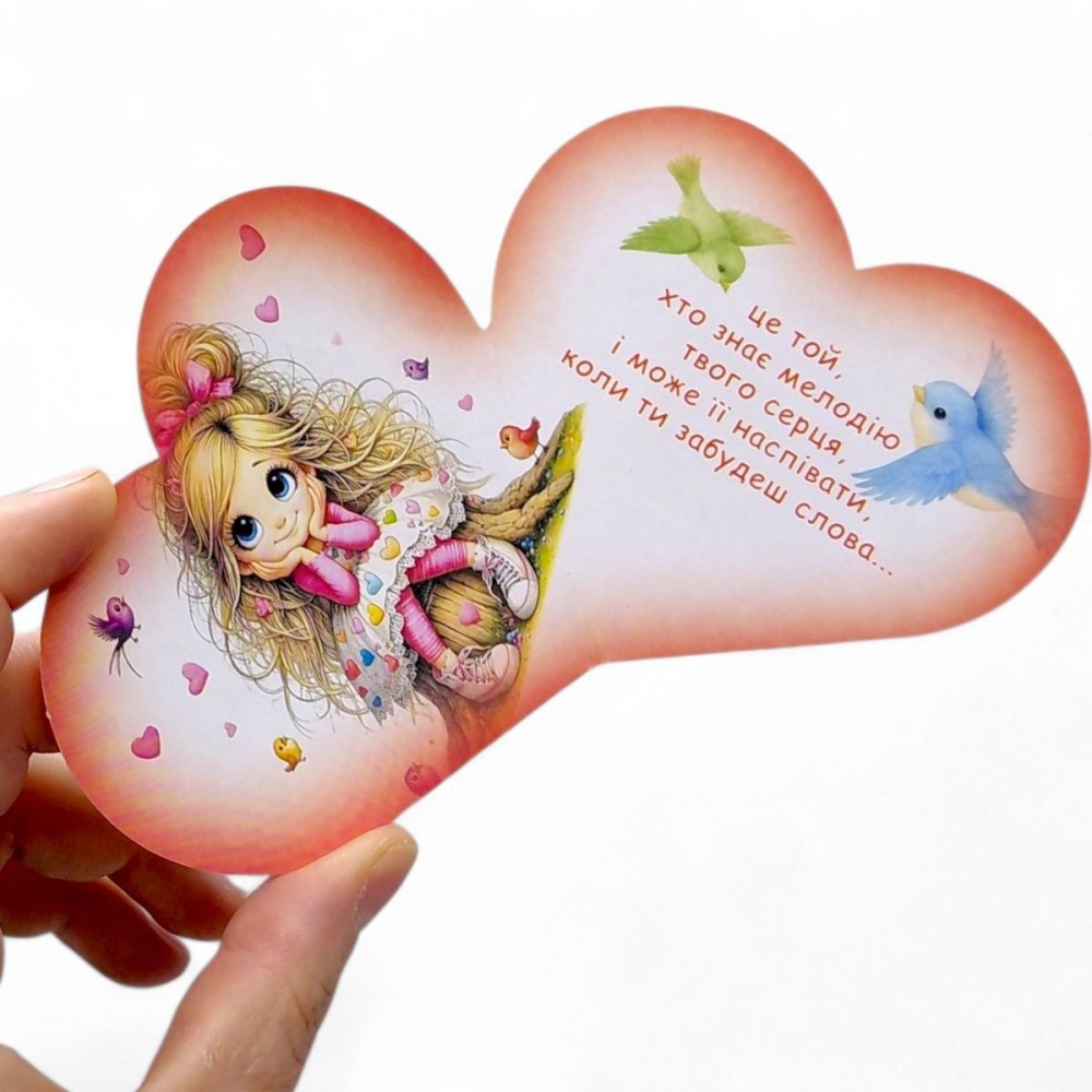 Открытка-валентинка в форме сердечка - это нежный и символический способ выразить свои чувства. Классическая форма сердца сразу ассоциируется с любовью, заботой и теплыми эмоциями, делая открытку идеальным дополнением к подарку или самостоятельным знаком внимания. Она подойдет для поздравлений на День святого Валентина, романтических сюрпризов или просто искренних слов близкому человеку. Внутри открытки пожелания на украинском, теплые слова, которые сделают момент получения открытки по-настоящему особенным и памятным. Размер валентинки в развернутом виде - 17,3х9,4 см.