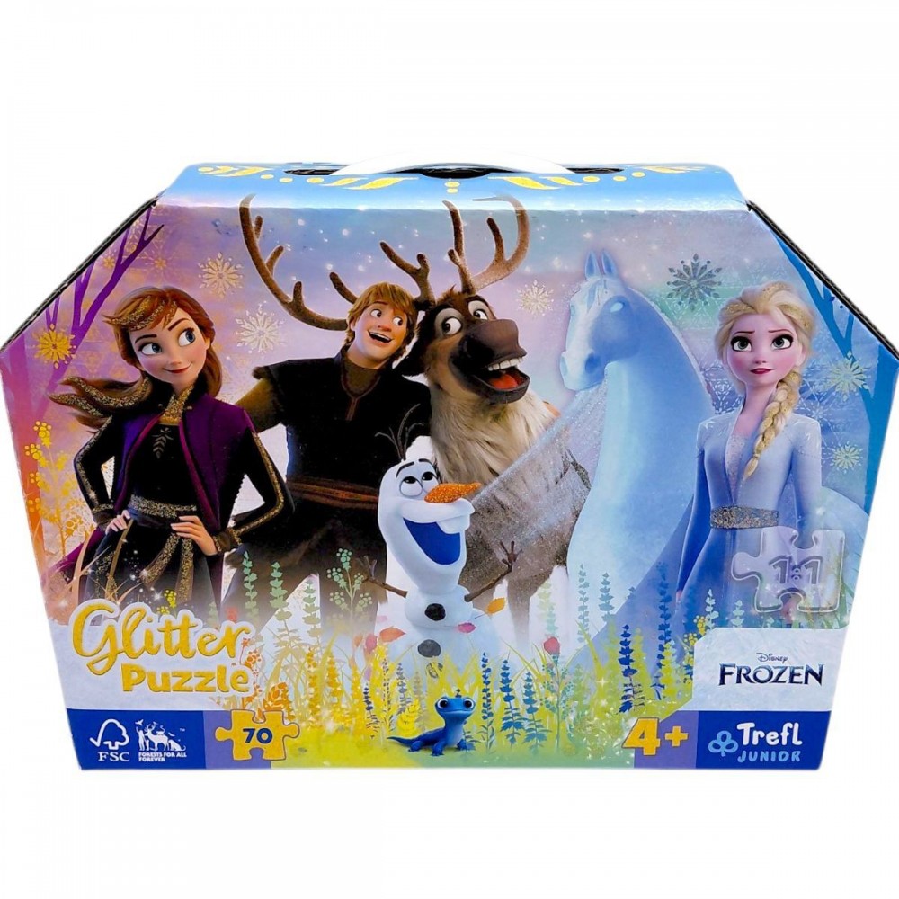 Яркие и красочные глиттерные пазлы на 70 элементов. Изготовлены из качественного, плотного картона. Развивают логическое мышление, мелкую моторику рук, усидчивость. Элементы пазла украшены яркими блестками. Размер одного элемента: 3х3 см. Размер готового изображения: 41 х 27,5 см.