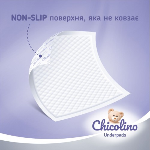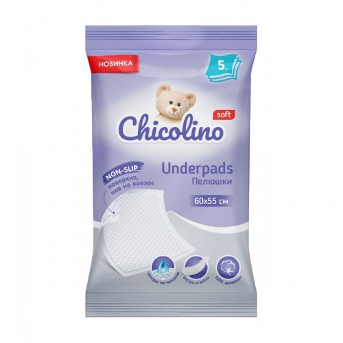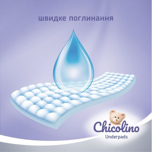 Пеленки поглощающие Chicolino удобны и незаменимы при смене подгузника и проведении других гигиенических процедур. Водонепроницаемый нижний слой обеспечивает надежную защиту кровати и других поверхностей от протекания влаги и обладает свойством «non-slip», что не позволяет пеленкам скользить по поверхности. 100% разрыхленная целлюлоза в составе пеленки делает ее комфортной, мягкой и безопасной в использовании.