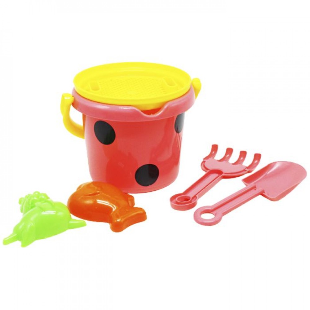 Яркий песочный набор. В комплекте: пластиковое ведёрко (14 х 16 см), ситечко, 2 пасочки, лопатка и грабельки. Набор идеально подойдёт для игр в песочнице или на пляже. Длина инструментов - 19 см. Выполнено из качественного и безопасного материала, ведерко крепкое и надежное. Обязательно понравится малышам от 3-х лет.__