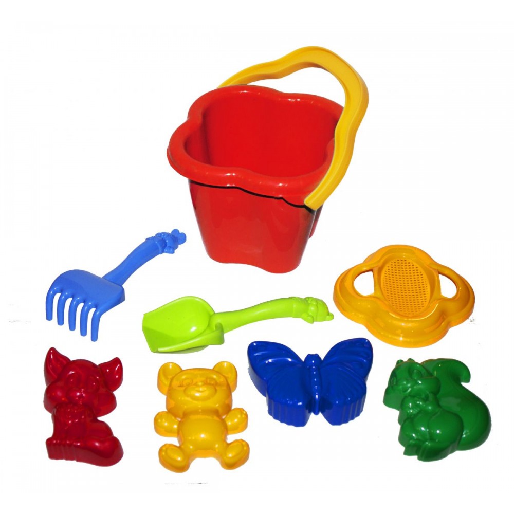 Песочный набор "Колокольчик" №2. В набор входит: ведро с ситом, грабли, лопатка и 4 пасочки. Подходит для игры дома, на улице, в саду и на пляже. Размер лопатки и грабелек - 21 см, размер пасочки - 10 - 12 см, ведро - 13,5 х 13,5 х 12,5 см.