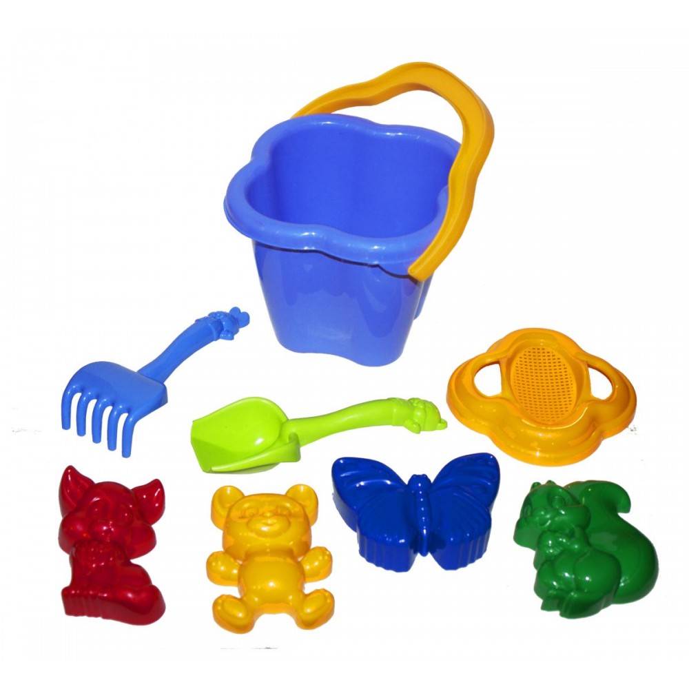 Песочный набор "Колокольчик" №2. В набор входит: ведро с ситом, грабли, лопатка и 4 пасочки. Подходит для игры дома, на улице, в саду и на пляже. Размер лопатки и грабелек - 21 см, размер пасочки - 10 - 12 см, ведро - 13,5 х 13,5 х 12,5 см.