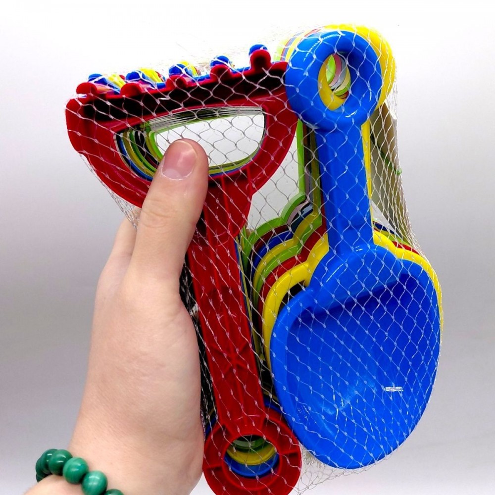 Пластиковый набор для игры с песком - грабельки и лопатка. Размер одного элемента - 18х8 см. В наборе 8 грабелек и 8 лопаток._
