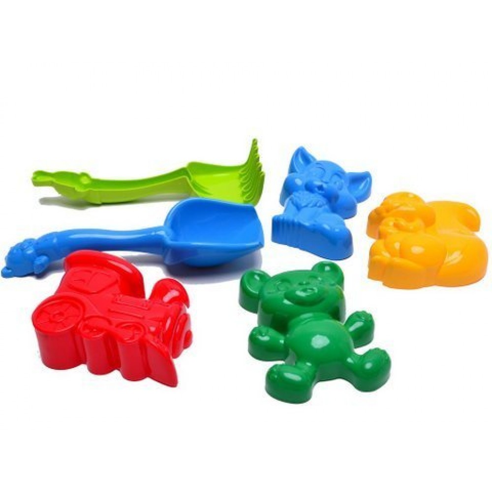 Яркий песочный набор. Состоит из лопатки (20 х 6,5 см), грабелек (19 х 7,5 см) и 4-х пасочек (~ 12 х 7 см).