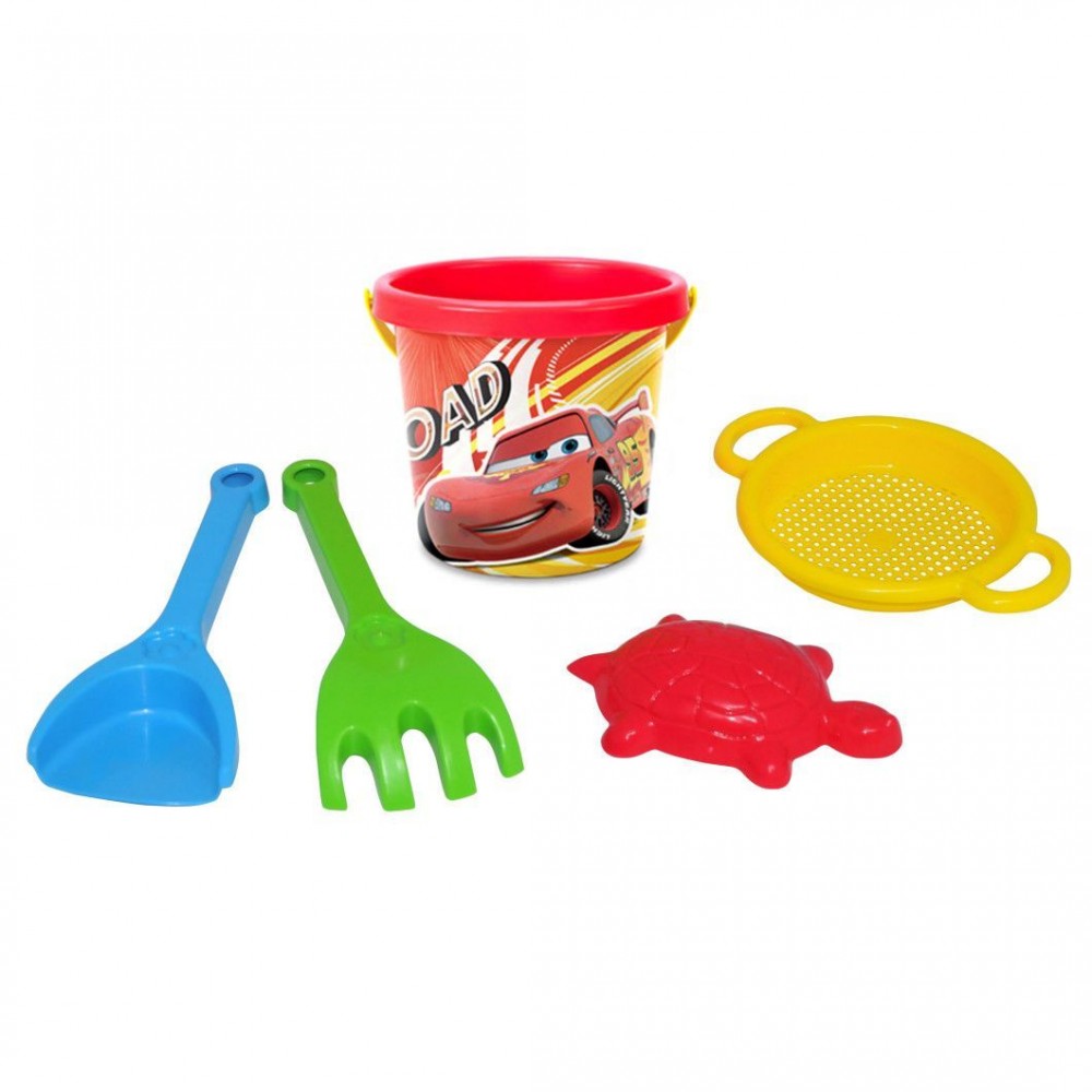 Песочный набор "Тачки". В набор входит: ведро (12х13х13 см), лопатка и грабельки (18 см), пасочка и сито. У сита есть две удобные ручки.