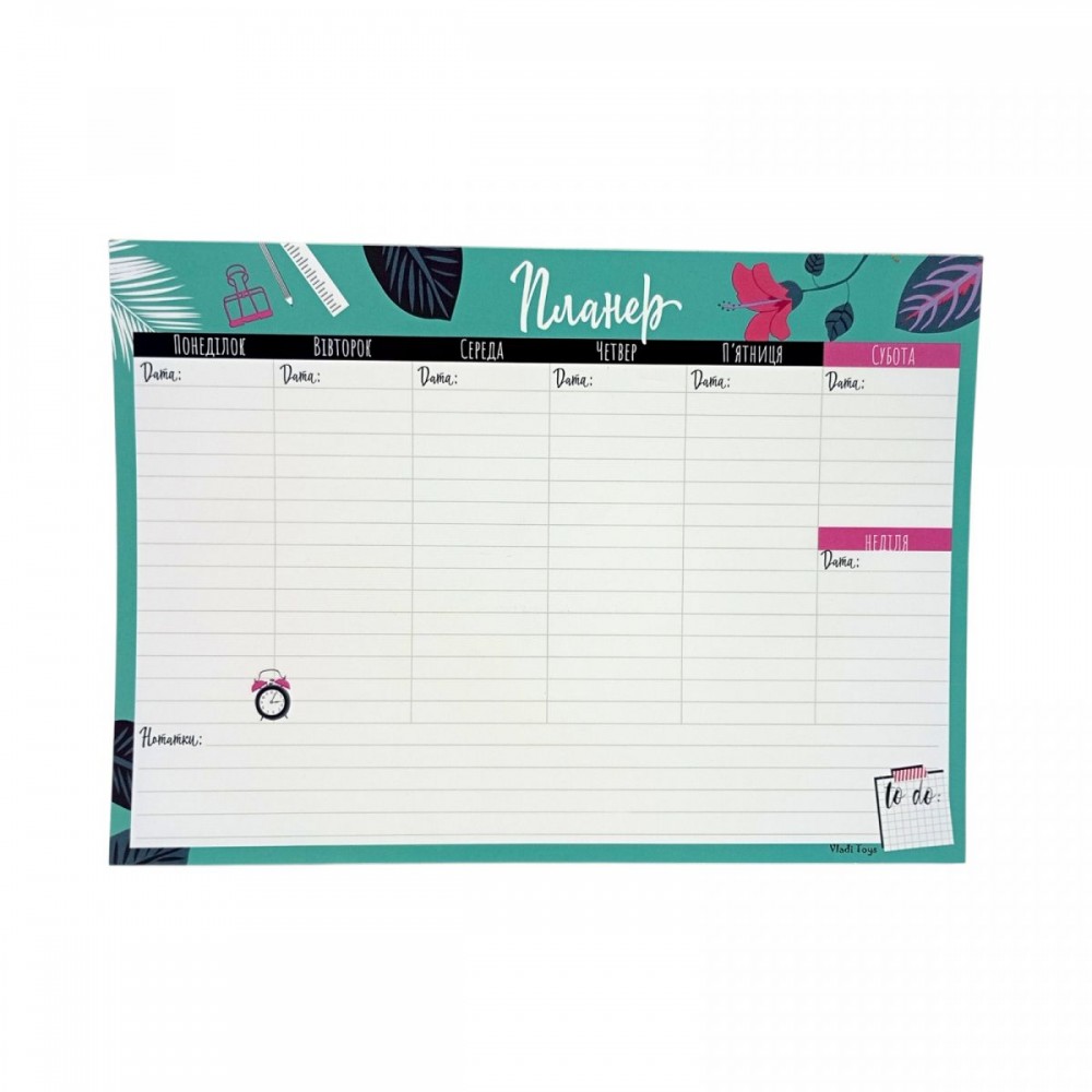 Удобный планер в неделю для детей и взрослых. Благодаря продуманному дизайну можно расписывать планы не только на неделю, но и добавить дополнительные цели или важную задачу в отдельное поле, где ее будет лучше заметно! В комплекте присутствует 54 листа — так что планера хватит на 378 дней! Размер одного листа 20 х 14,5 см.