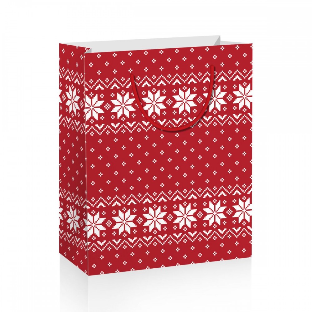 Яркий подарочный пакет с красивым новогодним орнаментом. Оснащён удобными ручками-веревочками. Материал: картон. Размер пакета: 26сх13х32 см.