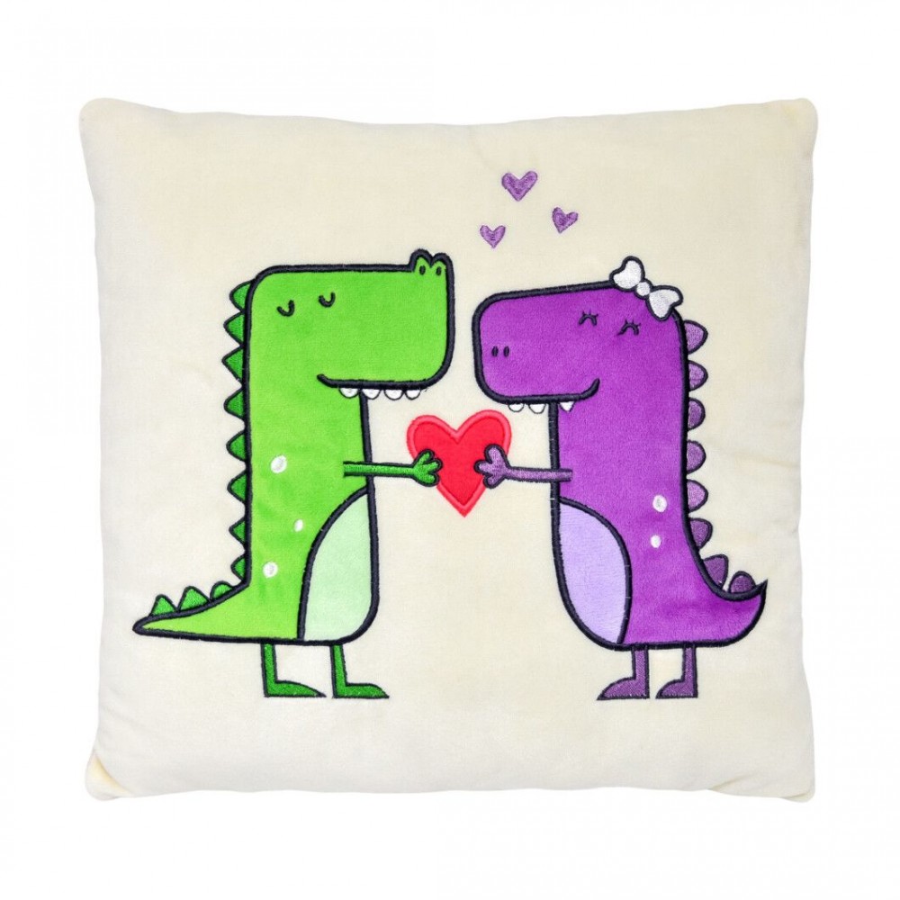 Милая мягкая подушка на которой изображены влюбленные динозаврики. Размер подушки 32х28х9 см. Выполнена из качественного и безопасного материала, приятная на ощупь.