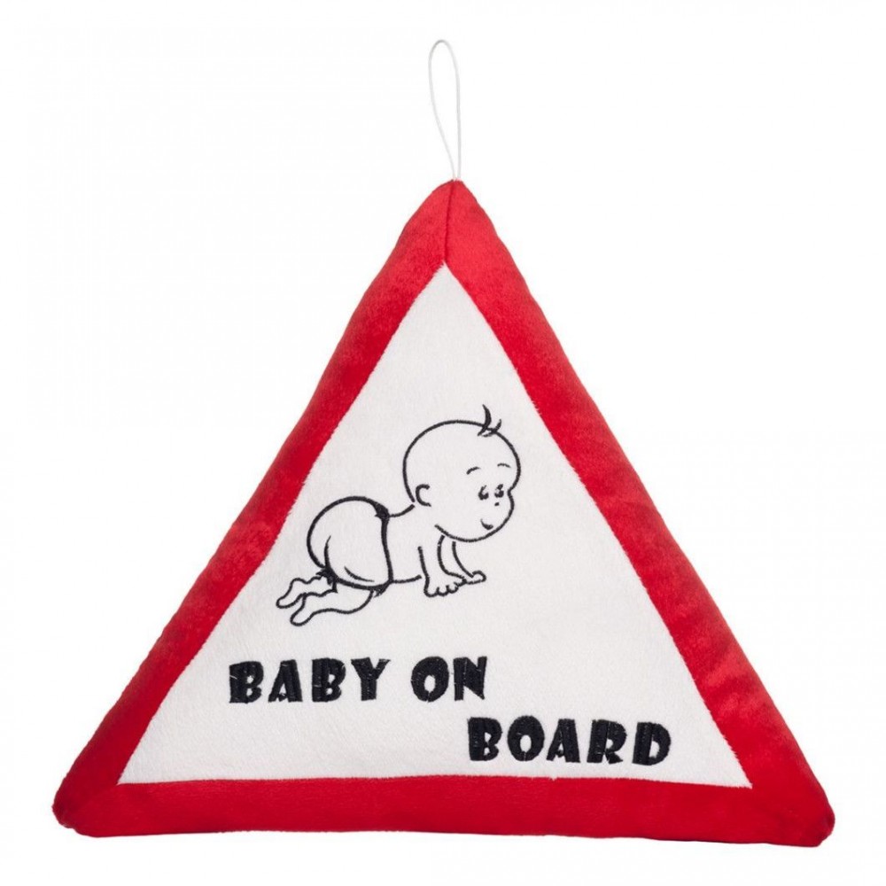 Подушка "Малыш". Дизайн подушки выполнен в виде дорожного знака-треугольника с рисунком малыша и надписью "Baby on board" - "Малыш в машине". Очень красочная и приятная на ощупь. Оснащена петелькой, за которую подушку можно будет подвесить в автомобиле. Состав: 100% полиэстер. Размер подушки: 38 х 38 см.
