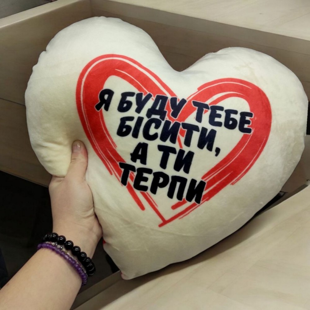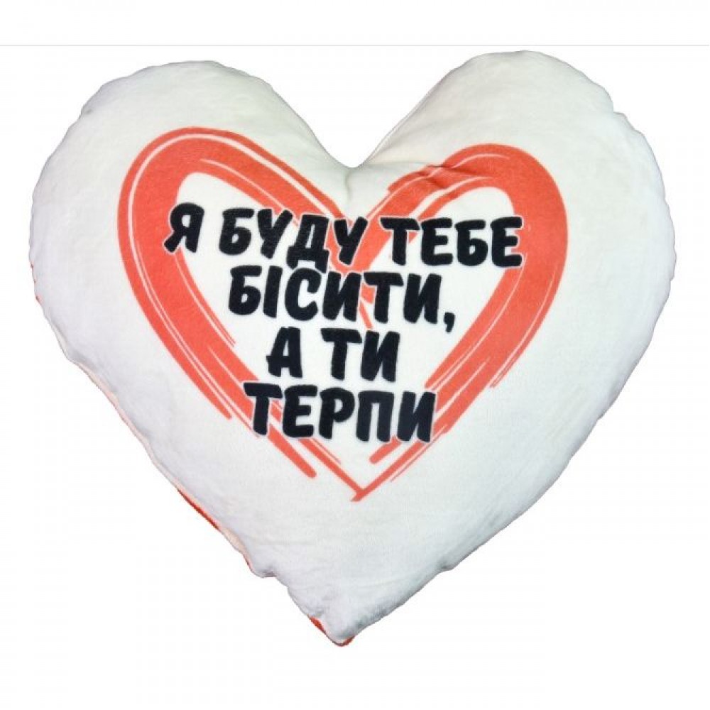 Мягкая игрушка-подушка в виде милого сердечка с принтом. Подушка приятная на ощупь и гладенькая. Все швы крепкие и надежные. Принт нанесен на одну сторону изделия. Размер - 40х13х38 см. Игры с плюшевыми игрушками прекрасно развивают у малыша воображение, фантазию, сюжетно образное мышление. Выполнено из качественных и прочных материалов. Для детей старше 3-х лет.