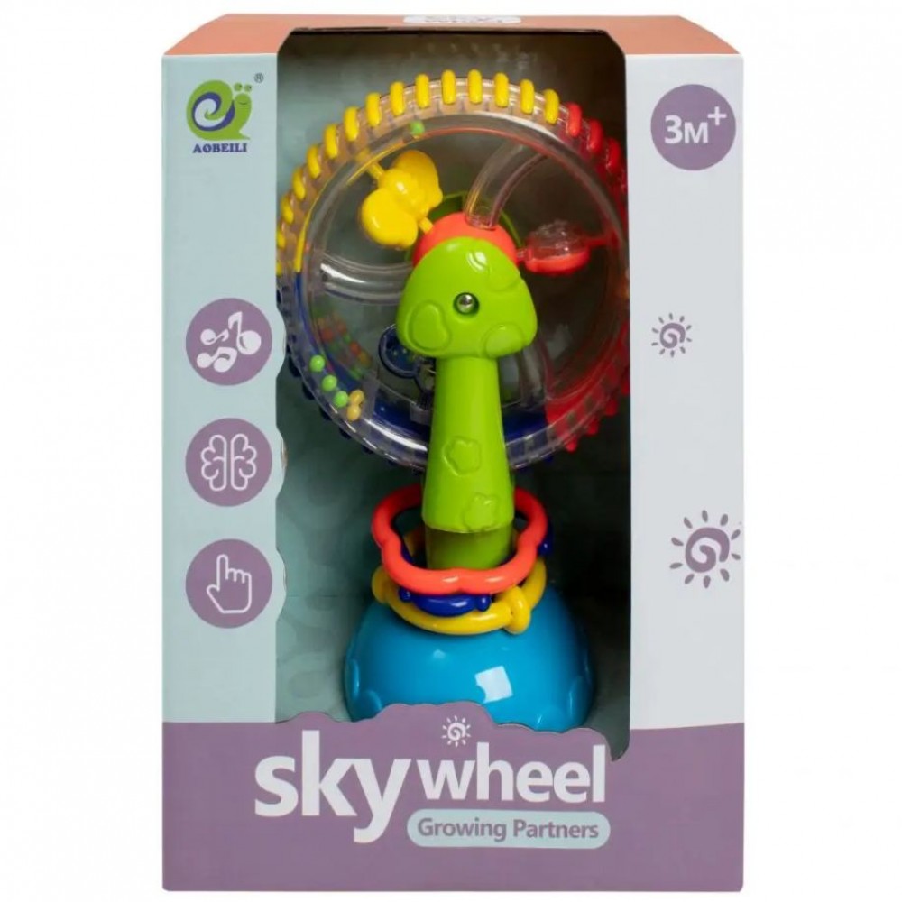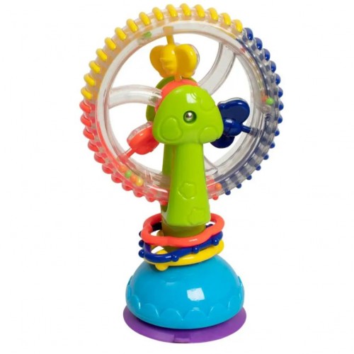 Необычная игрушка-погремушка в виде колеса обозрения. Колесо вращается, а вместе с ним и маленькие шарики внутри него, издавая приятный звук. Также игрушка имеет и другие интересные элементы: подвижные бабочки, геометрические фигуры. Игрушка на присоске. Размер - 11 х 8 х 20 см.