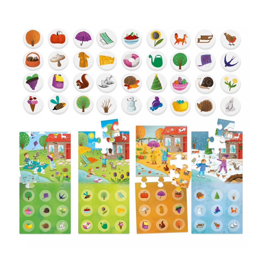 - 4 пазлы сезона; - 4 карты сезона; - 36 фишек.