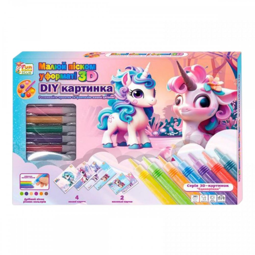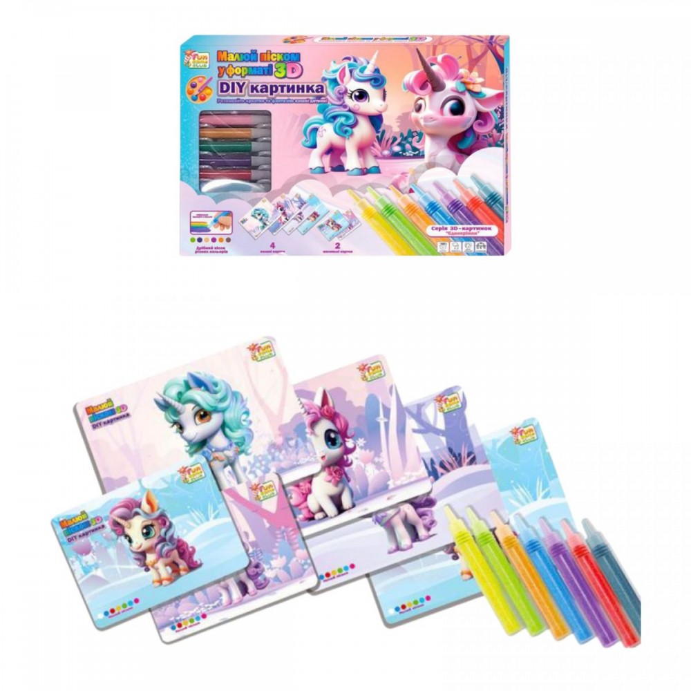 Интернет-магазин eToys предлагает вашему вниманию товар "Рисуй песком "Единорожки", 6 карточек, 6 цветов песка, щетка, в коробке" по цене 387 грн..
