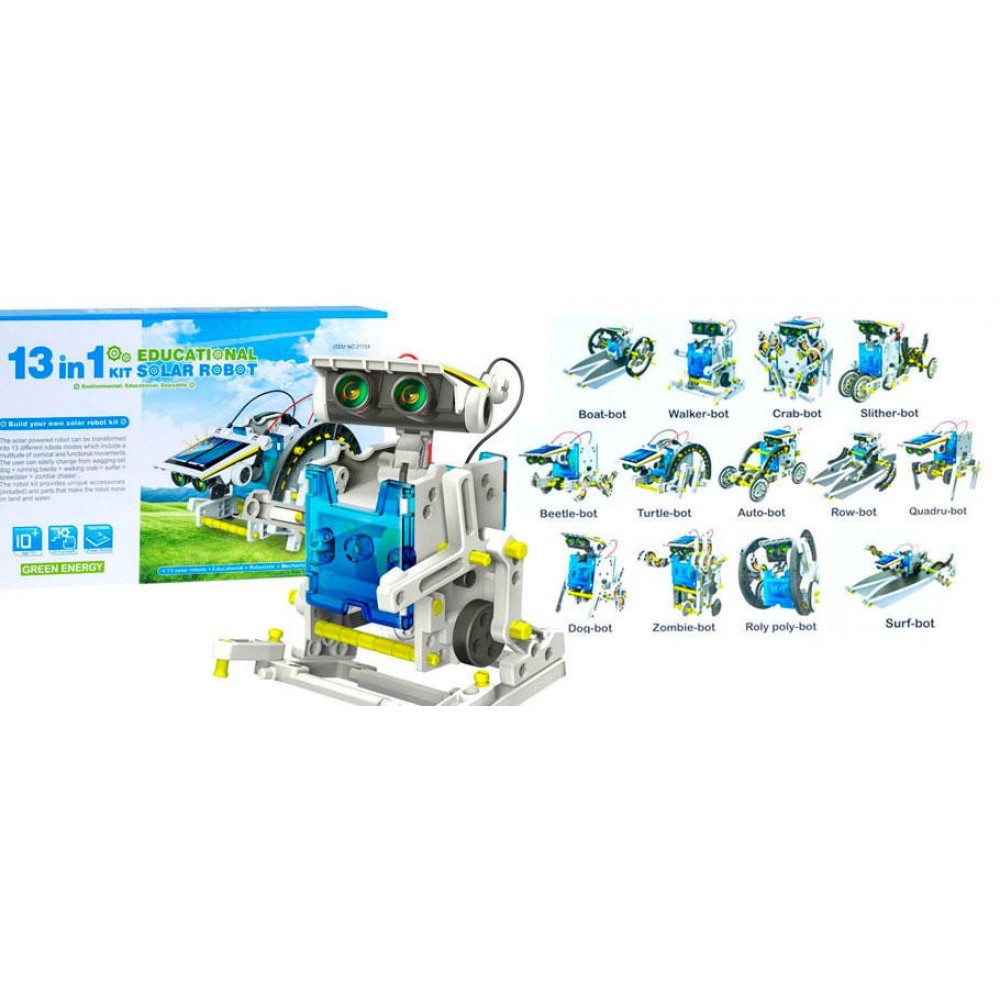 Робот-конструктор на солнечных батареях 13 в 1. Конструктор покажет ребенку преимущества солнечной энергии, и как она приводит в движение ту или иную игрушку из данного набора. Набор позволяет собрать 13 разнообразных роботов. *Игрушка может не работать в пасмурный день, в тени и без прямого солнечного света.
