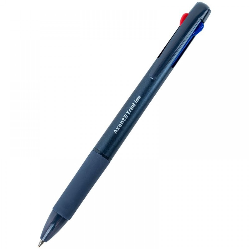 Ручка шариковая автоматическая Axent AB1105-A TrioLine, 3-в-1 – это удобный, качественный и многофункциональный инструмент, который экономит ваше время и пространство в пенале или сумке, ведь заменяет сразу три отдельных ручки. Особенности: • 3-в-1: три стержня разных цветов (синий, красный, черный) для максимального удобства; • качественный пишущий узел Premec; • лаконичный современный дизайн; • прочный пластиковый корпус; • резиновый грип для удобства; • автоматический механизм переключения стержней; • стержень имеет длину 97 мм и пишущий узел - 0,7 мм. Длина письма 900м. Переведено с помощью DeepL.com (бесплатная версия)