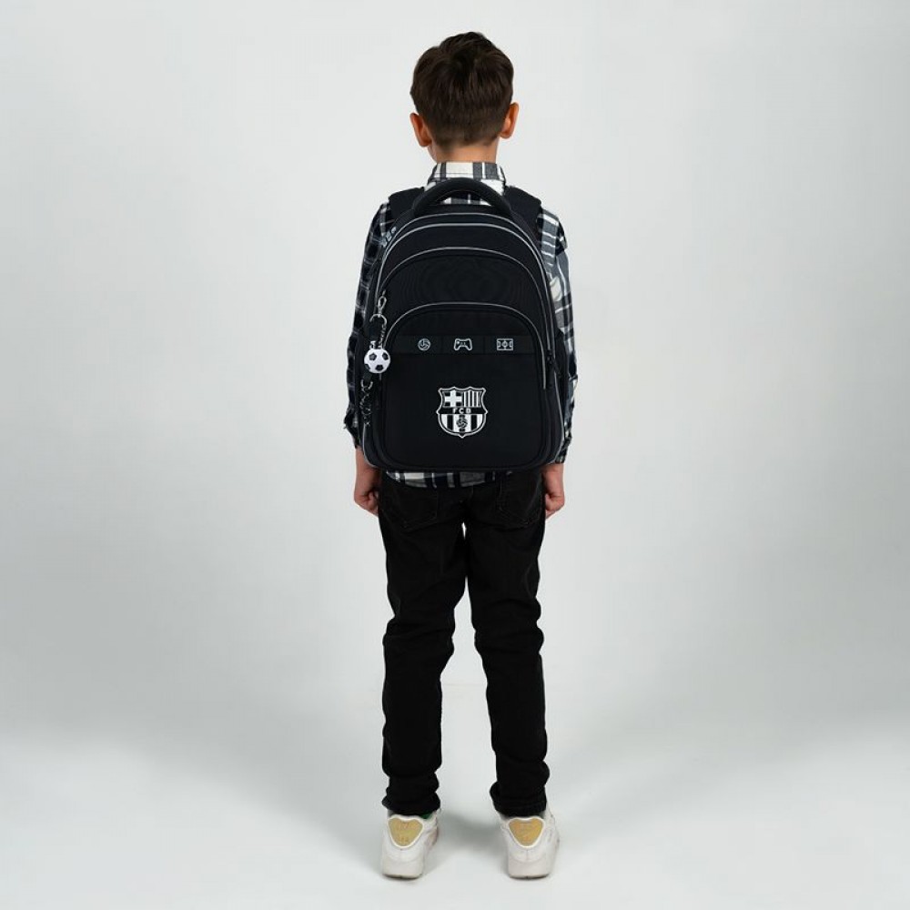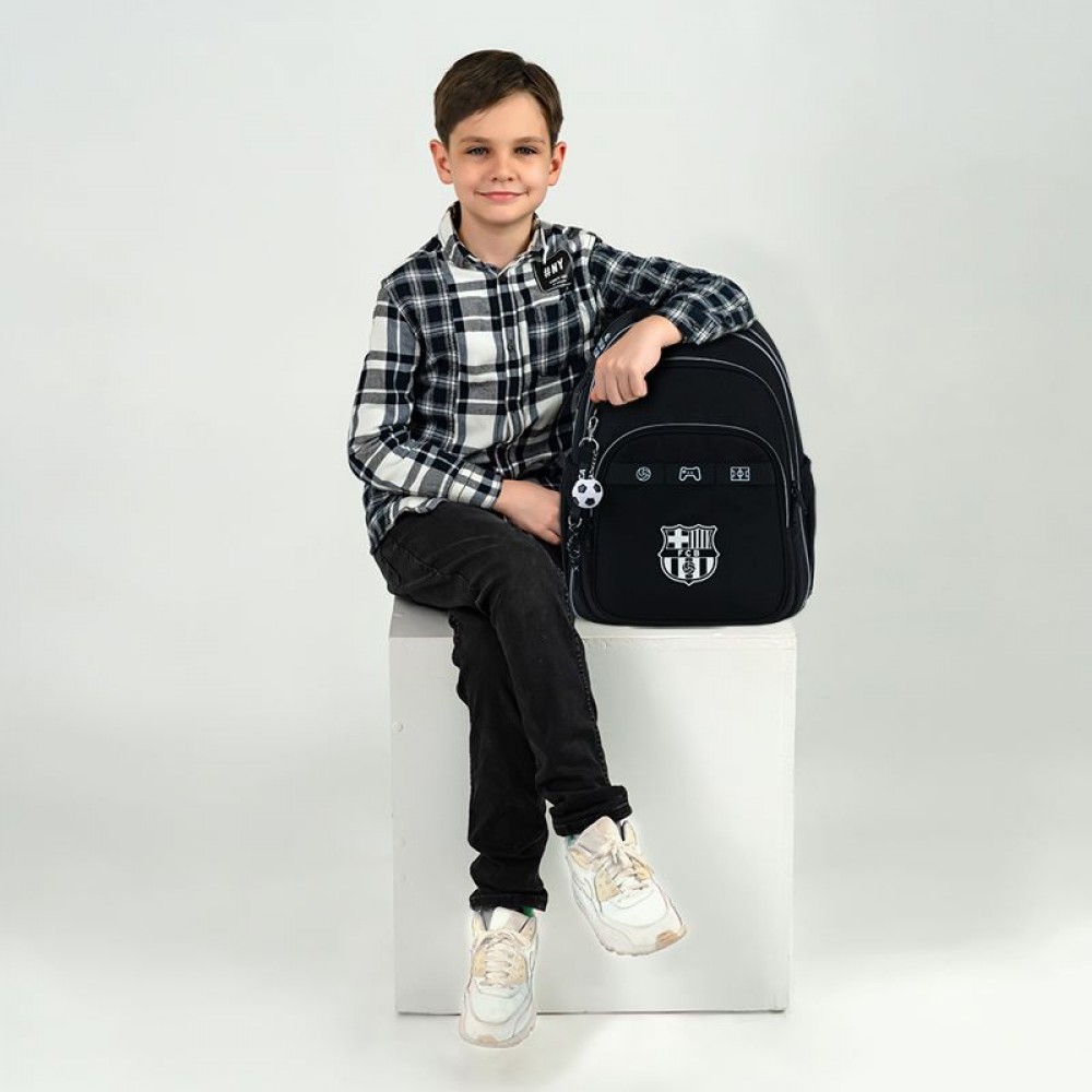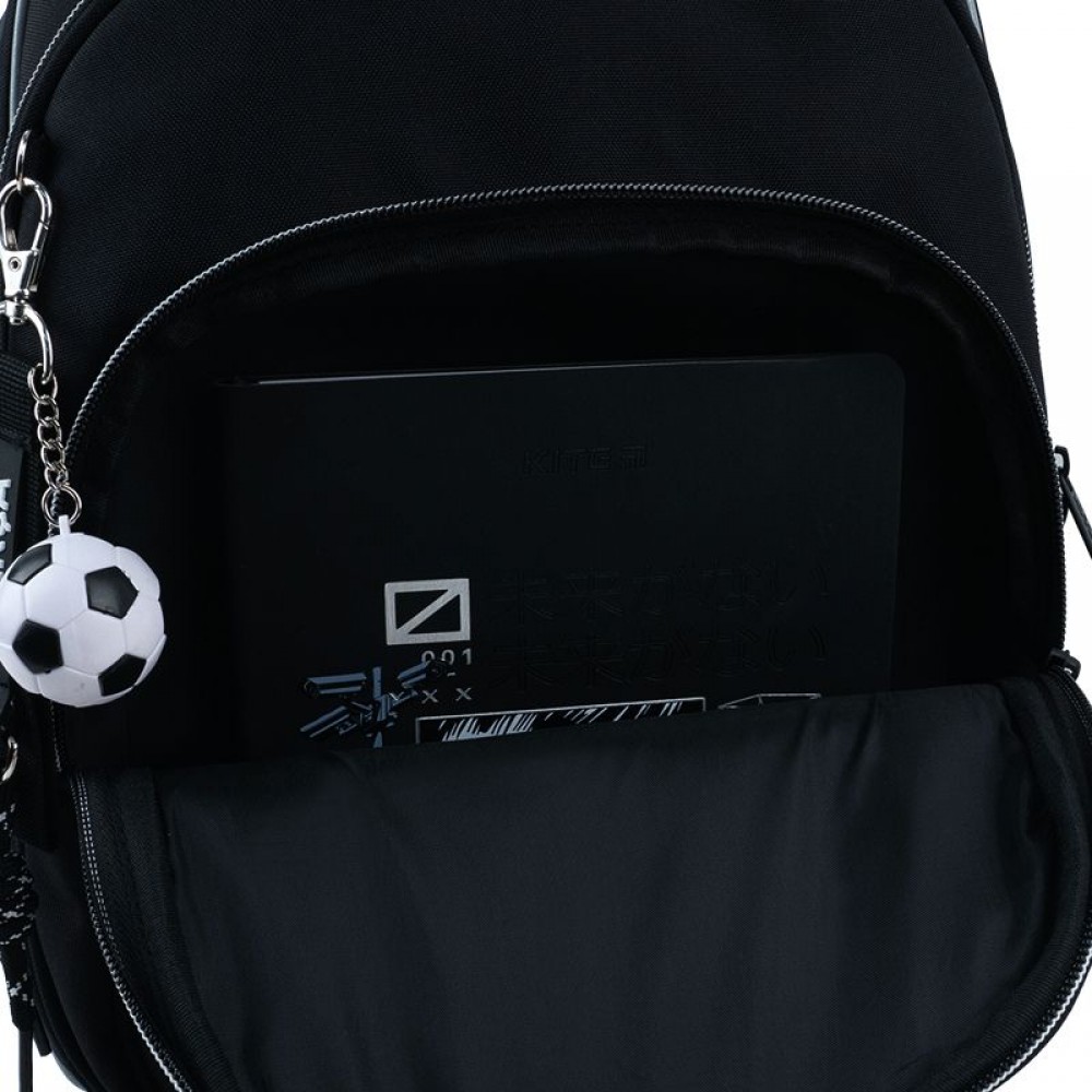 Рюкзак снаружи: запатентованная ортопедическая спинка Ergo Kids; широкие S-образные лямки; 2 отделения; 1 объемный передний карман; 2 боковых кармана; светоотражающие элементы; мягкая уплотненная ручка и текстильная петля; съемный нагрудный ремень; уплотненное дно с защитным покрытием; износостойкие молнии, надежная фурнитура. Рюкзак внутри: разделители с фиксирующей резинкой; карман для телефона с плюшевой подкладкой; органайзер; съемная ключница; брендированная подкладка; поле для персональных данных. Декор: бейдж из комбинированных материалов, объемная печать и печать на тесьме, брелок-подвеска из комбинированных материалов