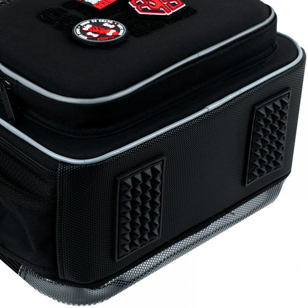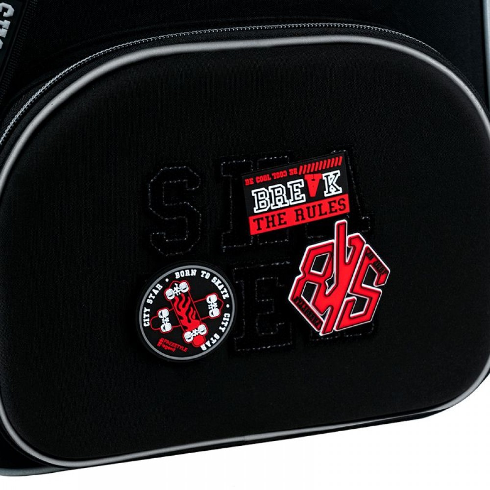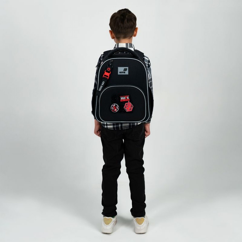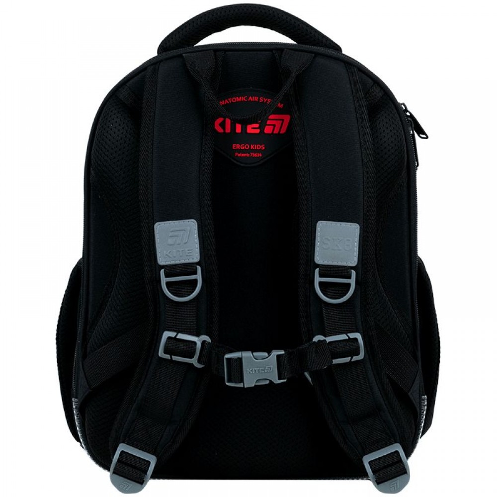 Рюкзак снаружи: запатентованная ортопедическая спинка Ergo Kids; широкие S-образные лямки; 2 отделения; 1 объемный передний карман; 2 боковых кармана; светоотражающие элементы; мягкая уплотненная ручка и текстильная петля; съемный нагрудный ремень; уплотненное дно с защитным покрытием и ножками; износостойкие молнии, надежная фурнитура. Рюкзак внутри: разделители с фиксирующей резинкой; карман для телефона с плюшевой подкладкой; органайзер; съемная ключница; брендированная подкладка; поле для персональных данных. Декор: нашивка из липучки, резиновые бейджи на липучке, брелок-подвеска из комбинированных материалов.