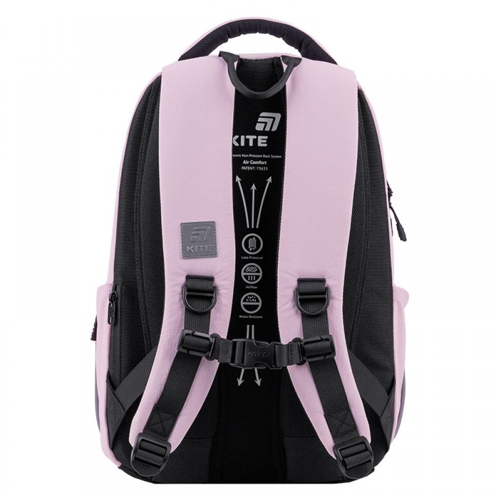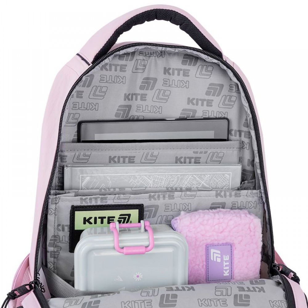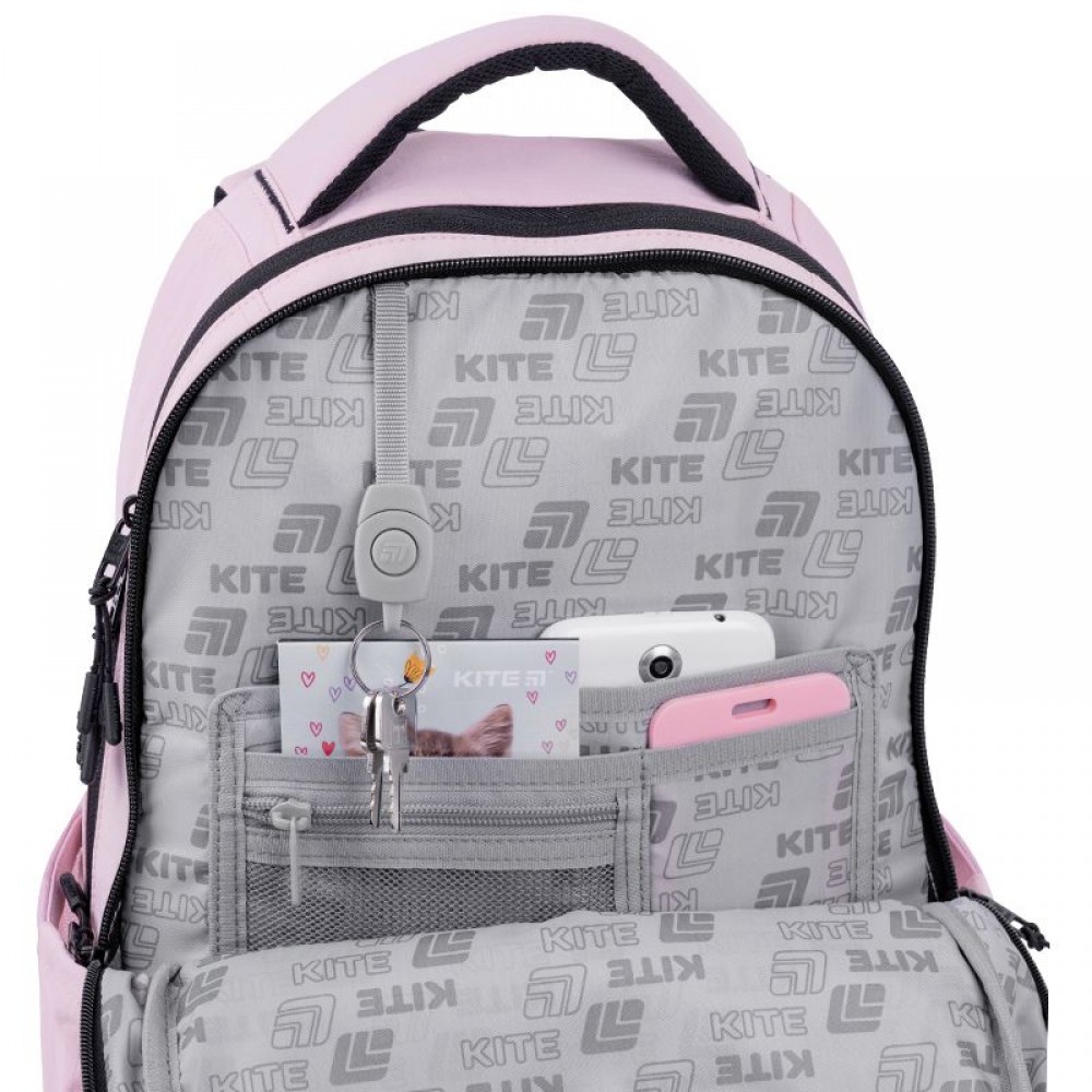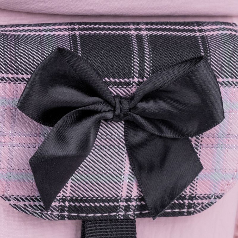 Рюкзак снаружи: ортопедическая спинка Air Comfort; широкие анатомические S-образные лямки; 2 отделения; 3 передних кармана; 2 боковых кармана; потайной карман на спинке; светоотражающие элементы; мягкая уплотнённая ручка и ручка-петля; съёмный нагрудный ремень; уплотнённое дно; надёжные молнии и фурнитура. Рюкзак внутри: внутренние разделители с резинкой; карман для планшета; карман для телефона с плюшевой подкладкой; внутренний карман на молнии; органайзер; съёмная ключница; брендированная подкладка. Декор: ткань - полиэстер с эффектом жатки в комбинации с плюшевой тканью; аппликация из стразов; объемный принт с блестками; атласный нашитый бант; молния с зубцами в форме сердечек на переднем кармане; металлическая цепочка на карабинах.