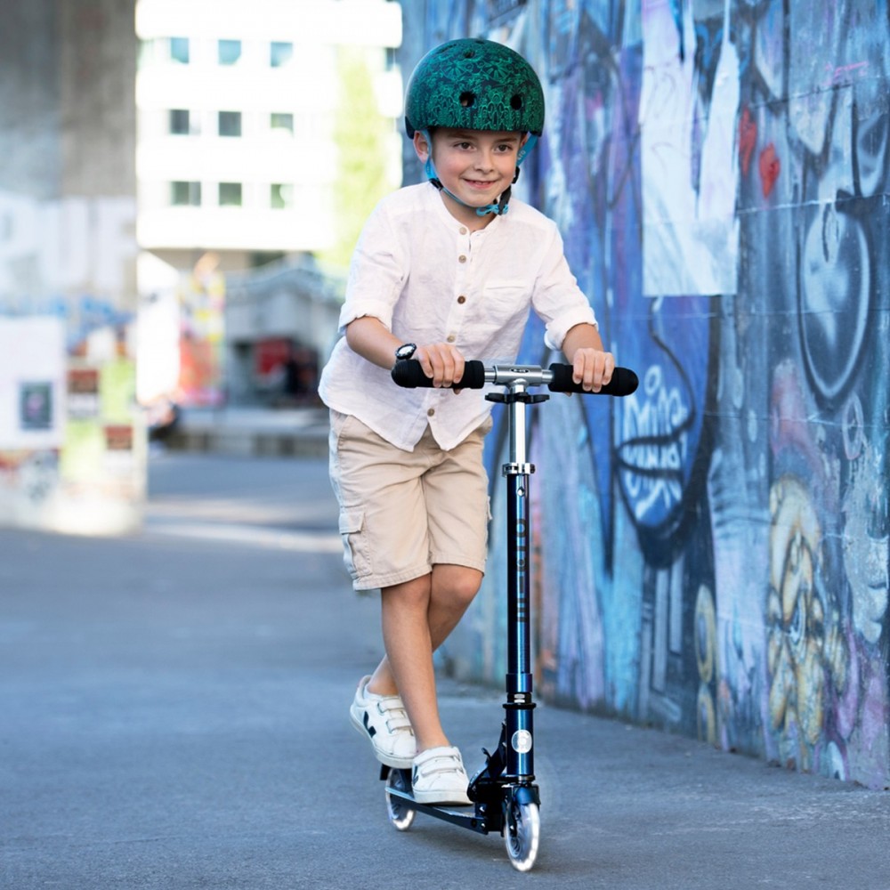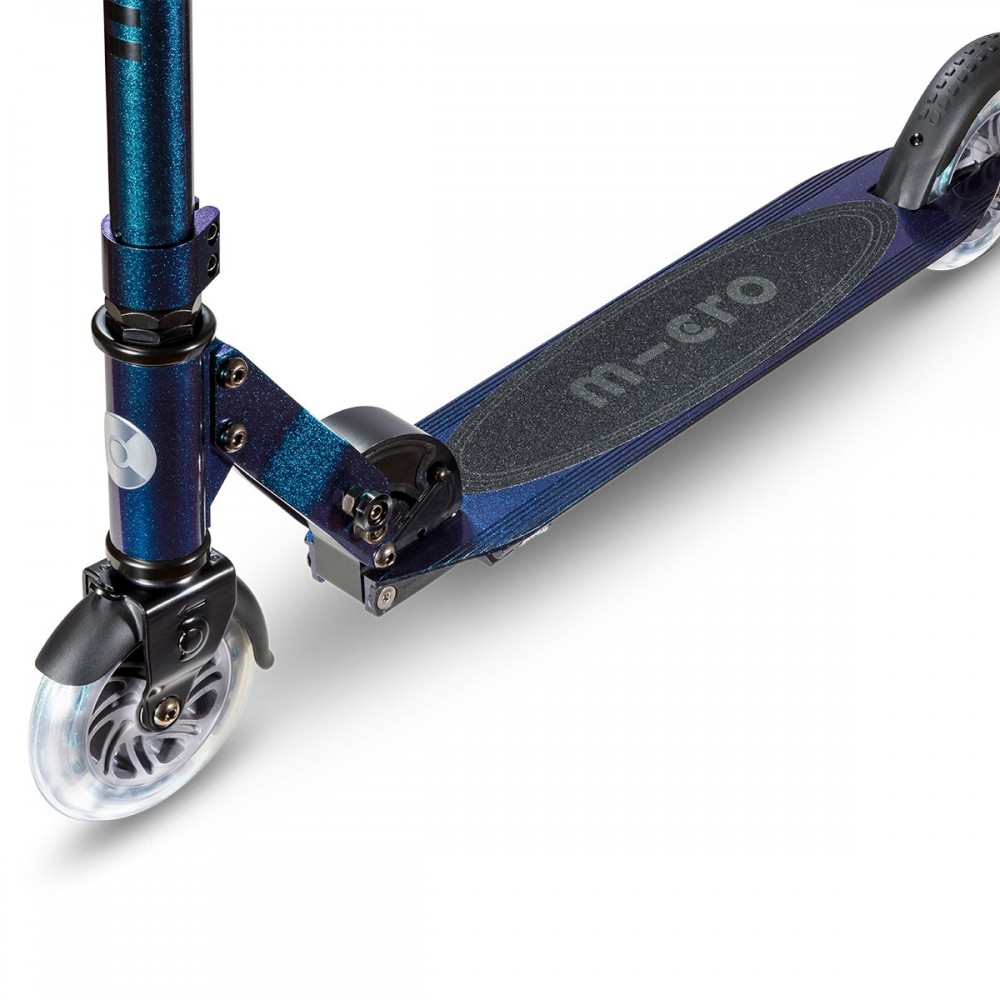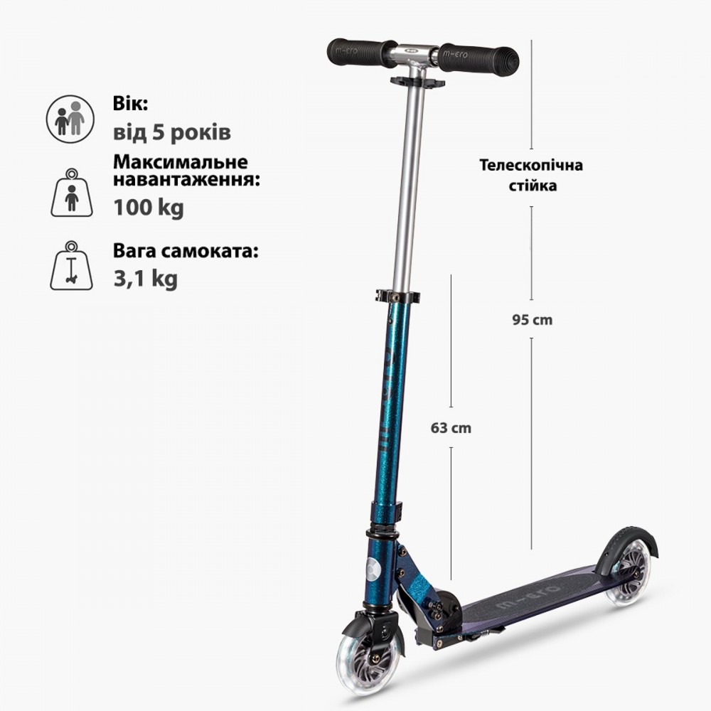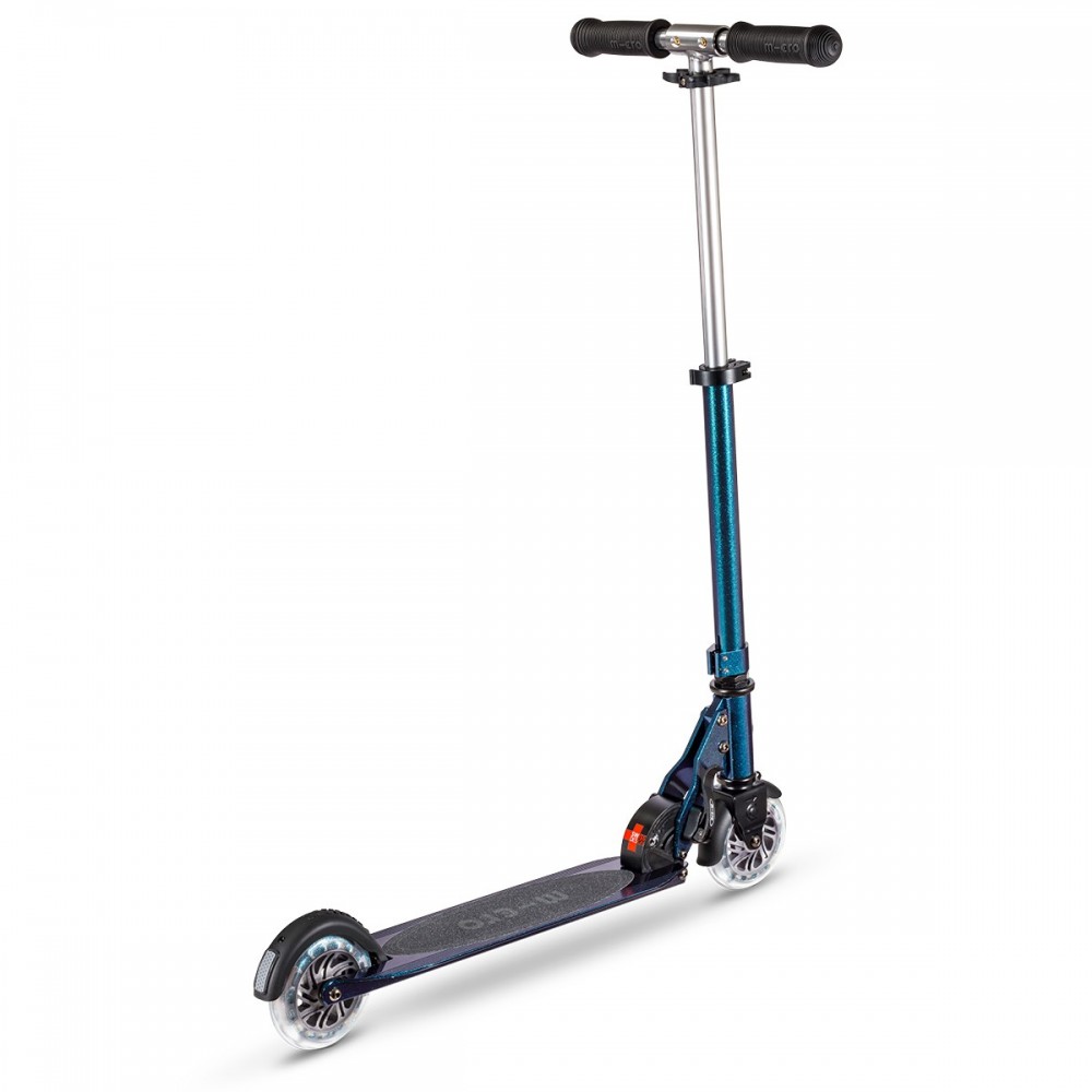 Самокат Micro серии 'Sprite LED' — ПЕРЛАМУТРОВЫЙ МИКС — совершенный и прочный двухколесный самокат. Он оснащен светящимися колесами и складной рамой.