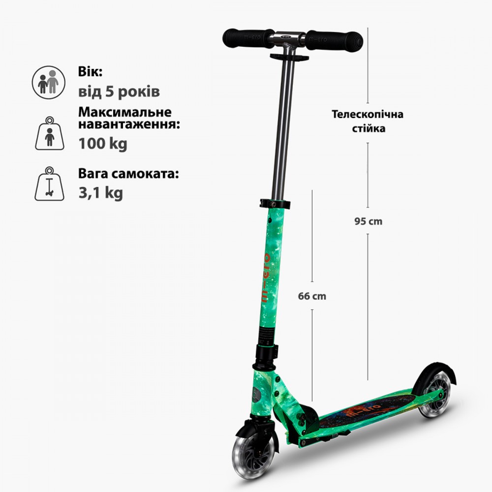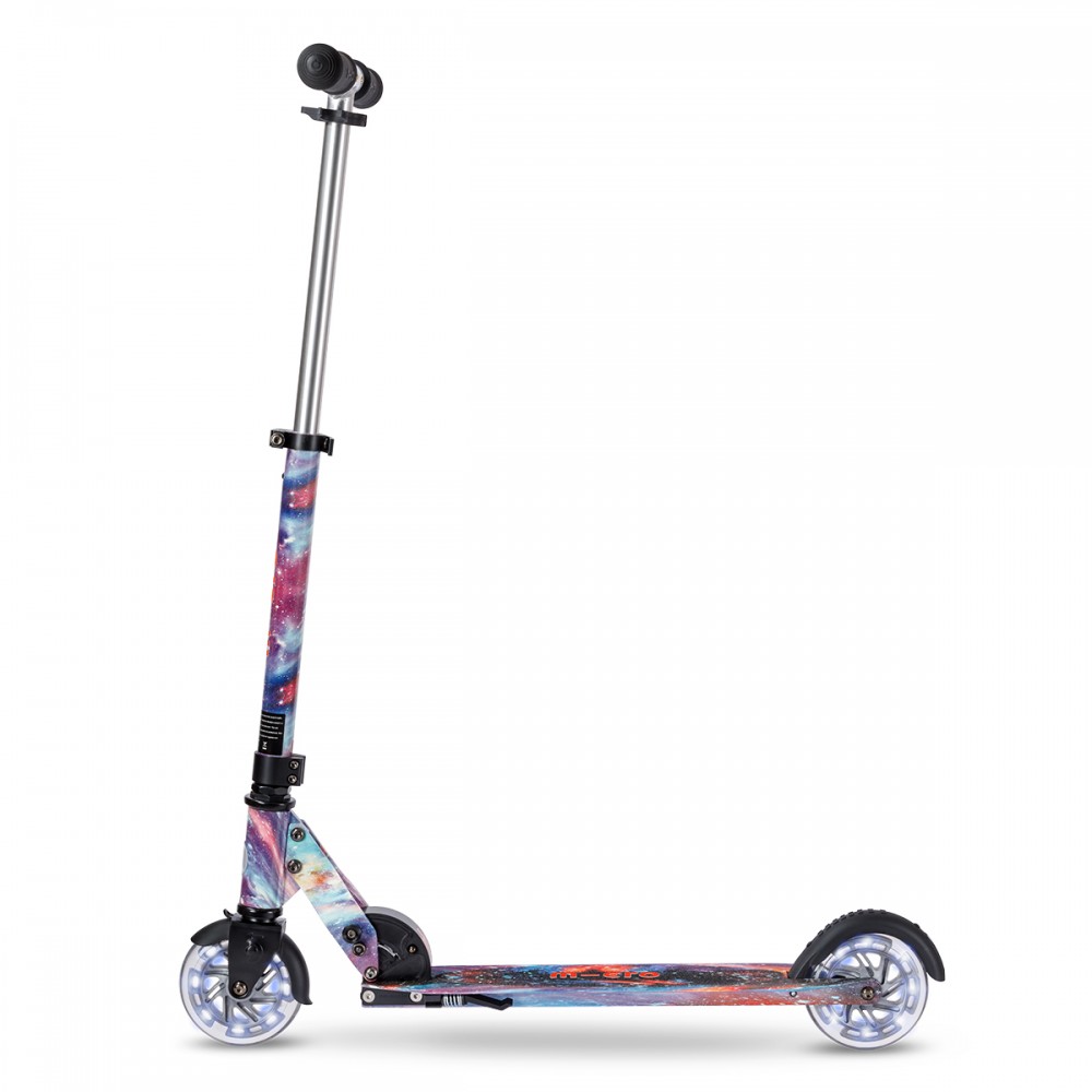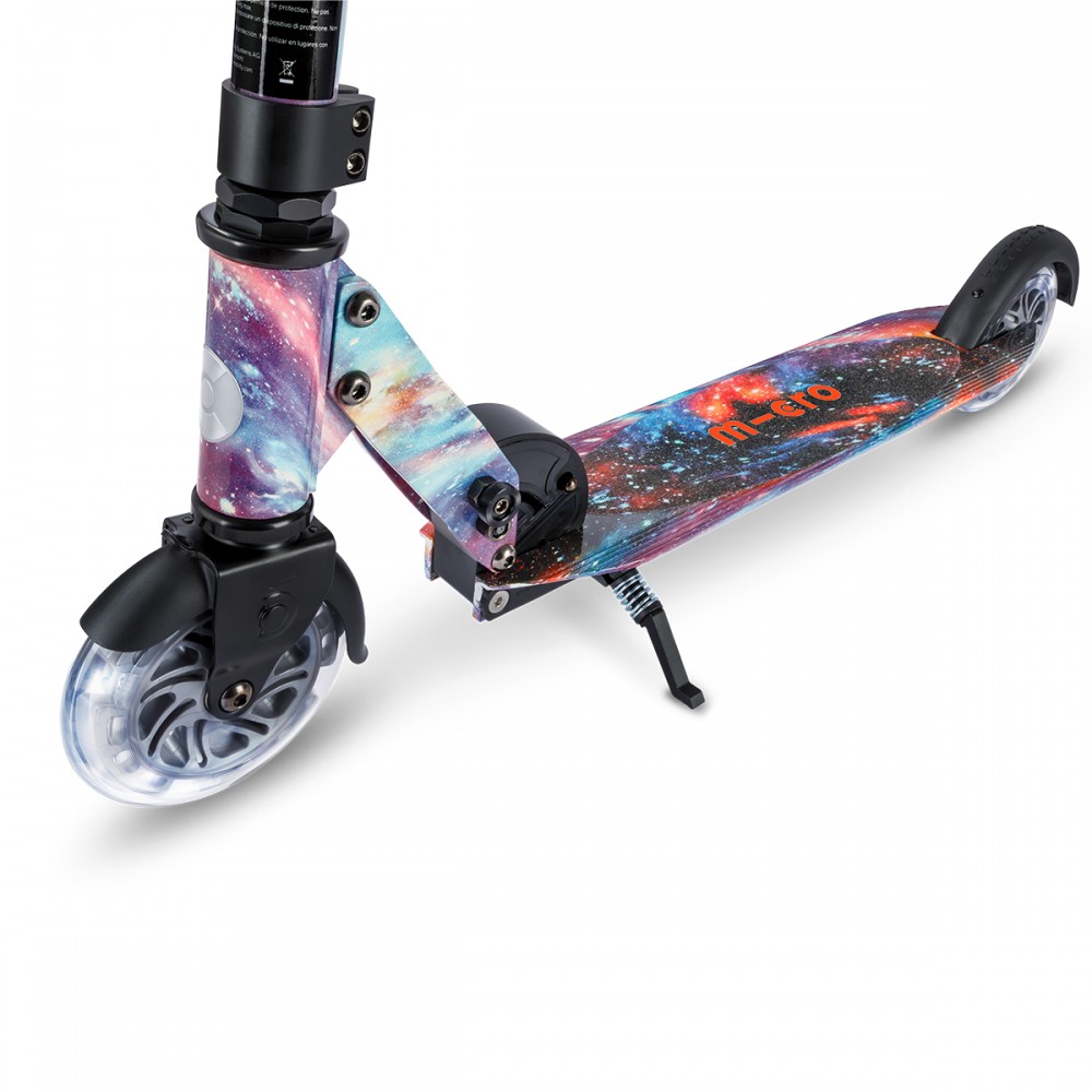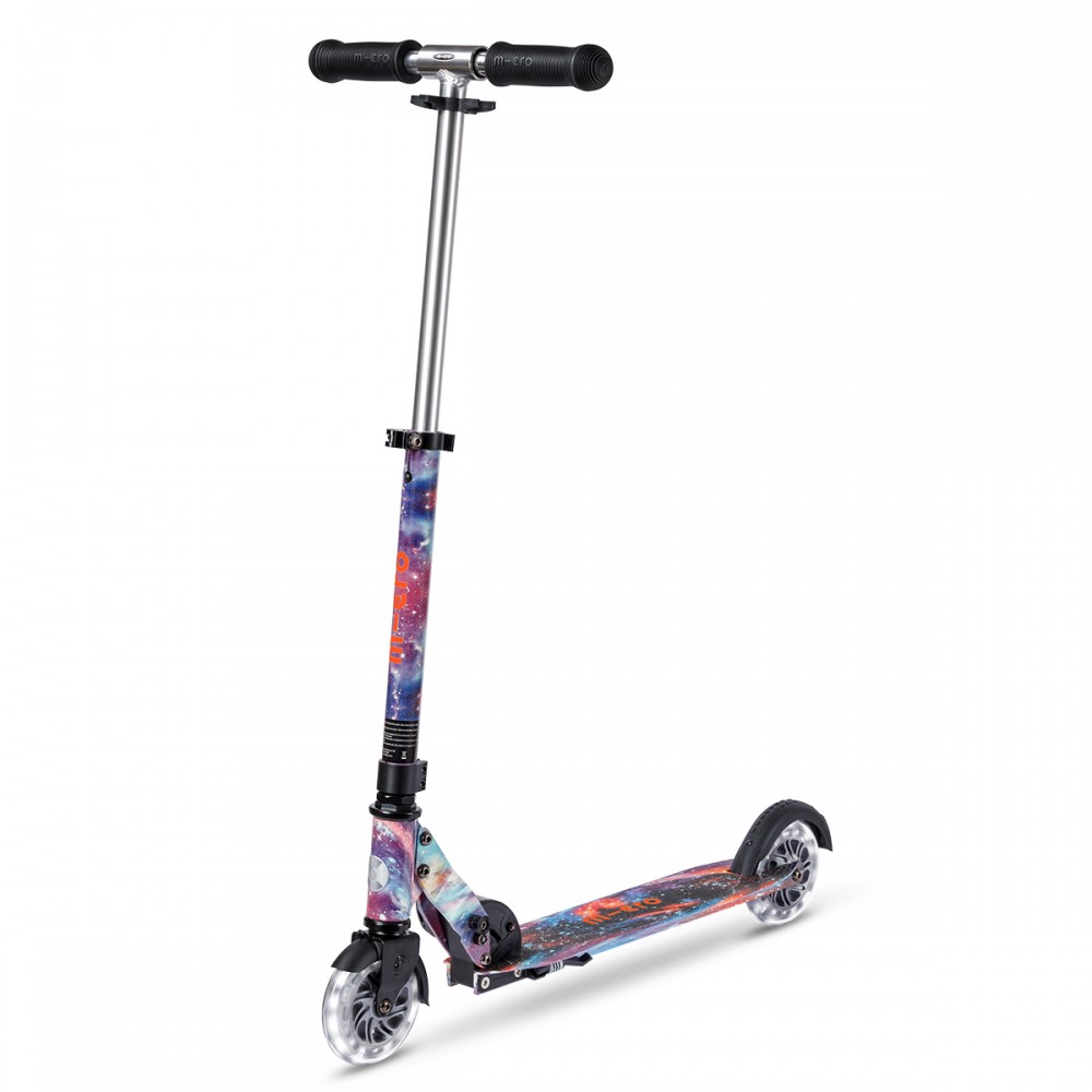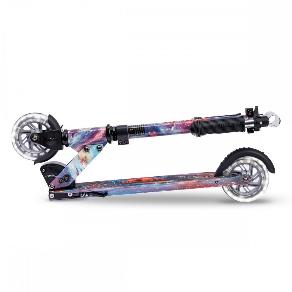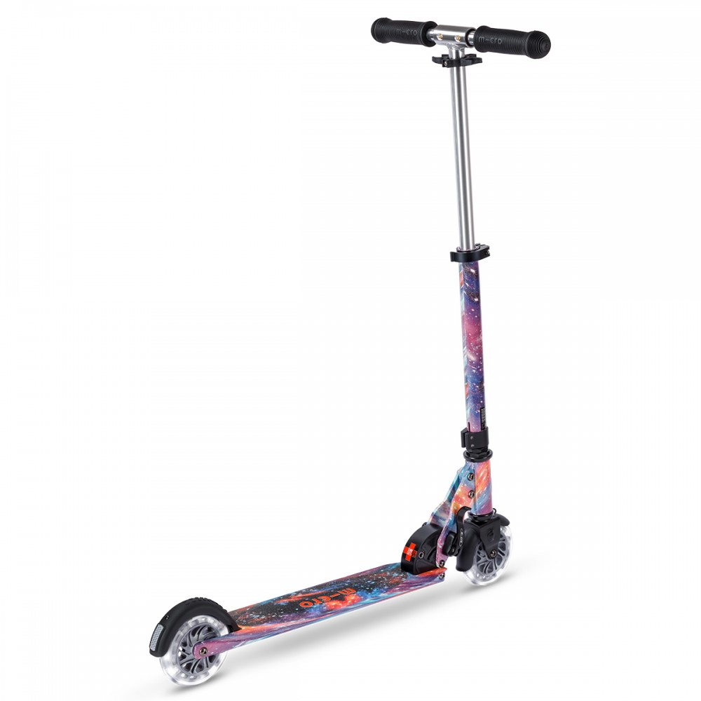 Самокат Micro серии 'Sprite Glow LED Art Collection' — КОСМОС — совершенный и прочный двухколесный самокат. Он оснащен светящимися колесами и складной рамой.
