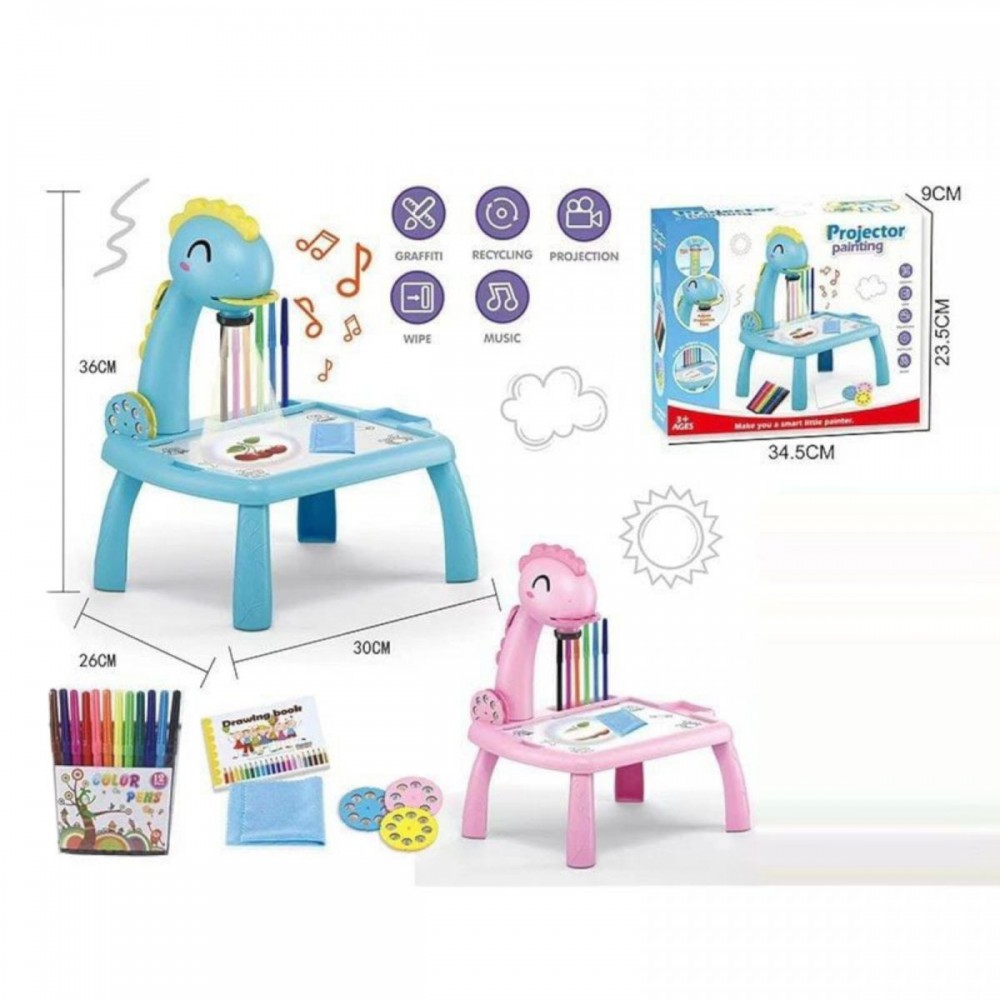 Интернет-магазин eToys предлагает вашему вниманию товар "Столик с проектором, "Динозавр" 3 диска, фломастеры, салфетка, на батарейках, музыка, подсветка, в коробке" по цене 538 грн..