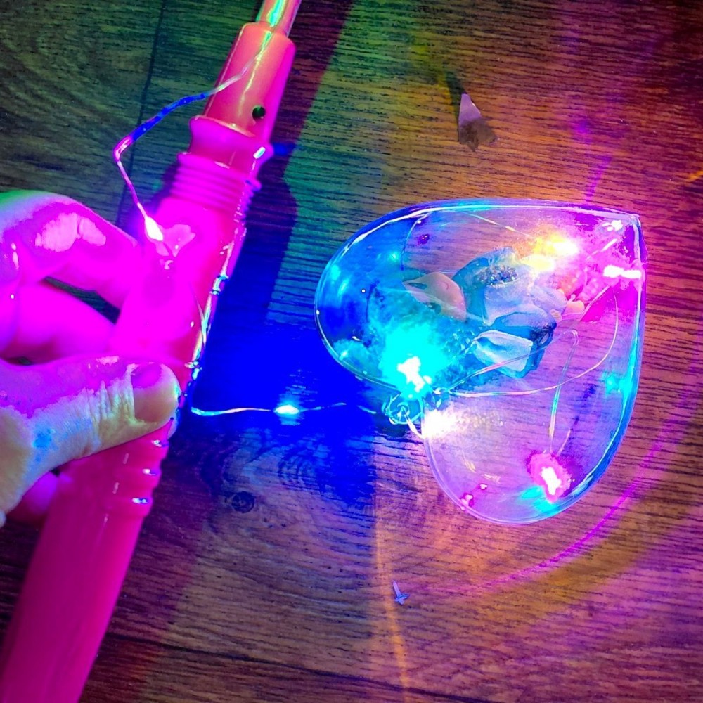 Пластиковая палочка, которая обязательно создаст праздничную атмосферу. Игрушка светится и имеет три разных режима подсветки, создавая сказочную атмосферу. Сердце можно открыть, чтобы забрать миленький брелок. Изготовлен из качественного и прочного материала. Размер палочки 22х2,5х2,5 см. Размер сердечка 9х9х5 см.