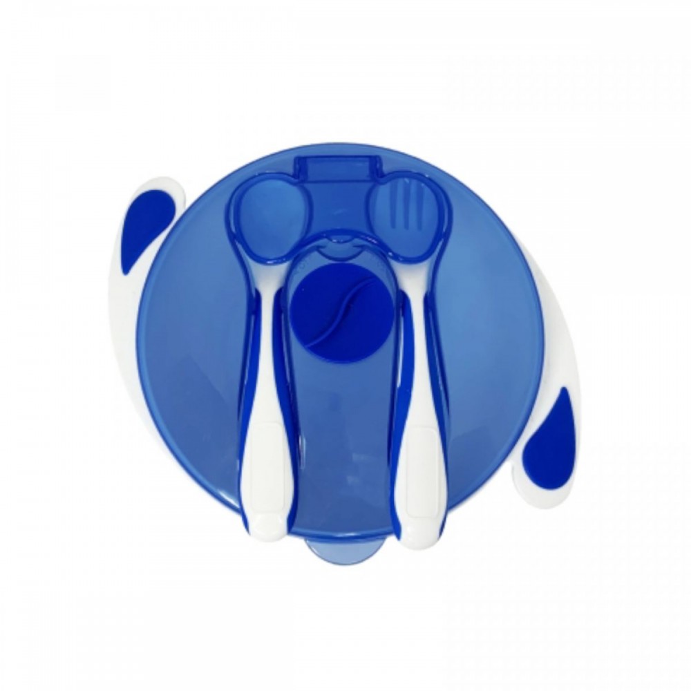 Нескользящие ручки у тарелки и приборов помогут ребенку есть опрятнее, не опрокидывая миску, на дне которой надежна присоска. Удобная крышка с клапаном не только позволяет удобно и компактно хранить набор, но и делает его ланчбоксом, чтобы удобно переносить пищу малыша. В комплекте идет вилка и ложка Материал тарелочки – пищевой пластик. Объем 300мл. Рекомендовано для детей с рождения.