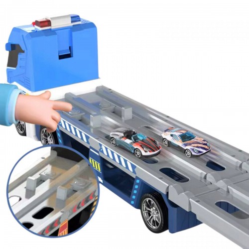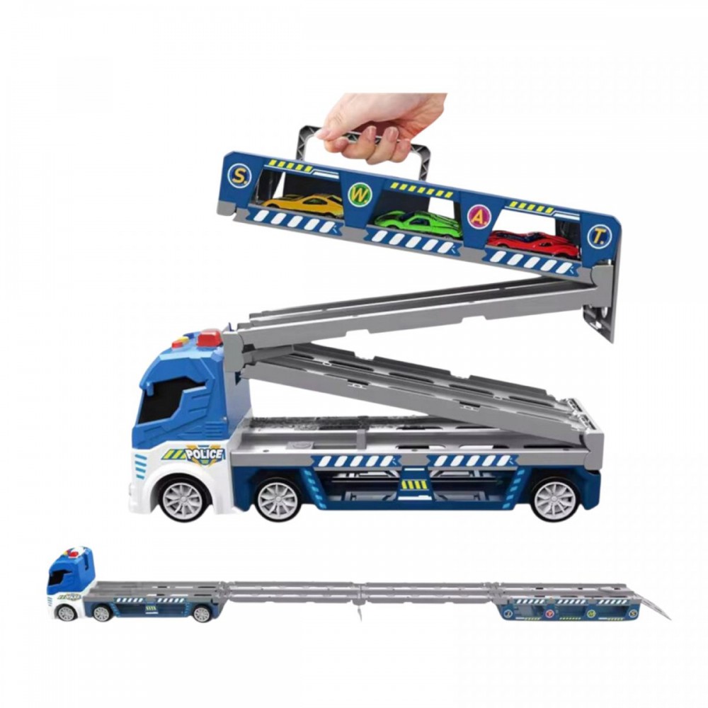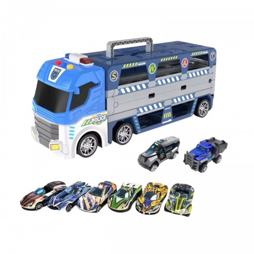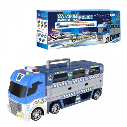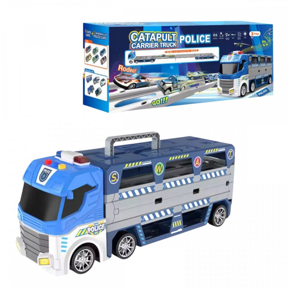 Интернет-магазин eToys предлагает вашему вниманию товар "Трейлер-трек "Полиция", размер 38х10.5х15 см, длина трека 135 см, механический запускатель, подсветка, звук, 2 металлопластиковые модели, 6 пластиковых моделей, в коробке" по цене 881 грн..
