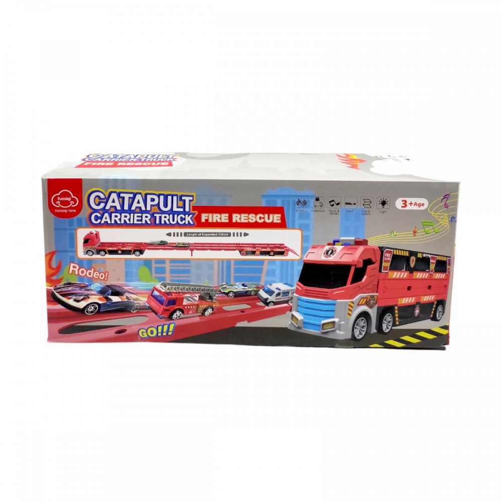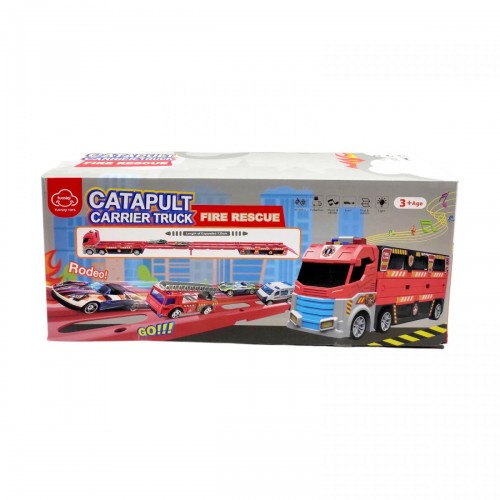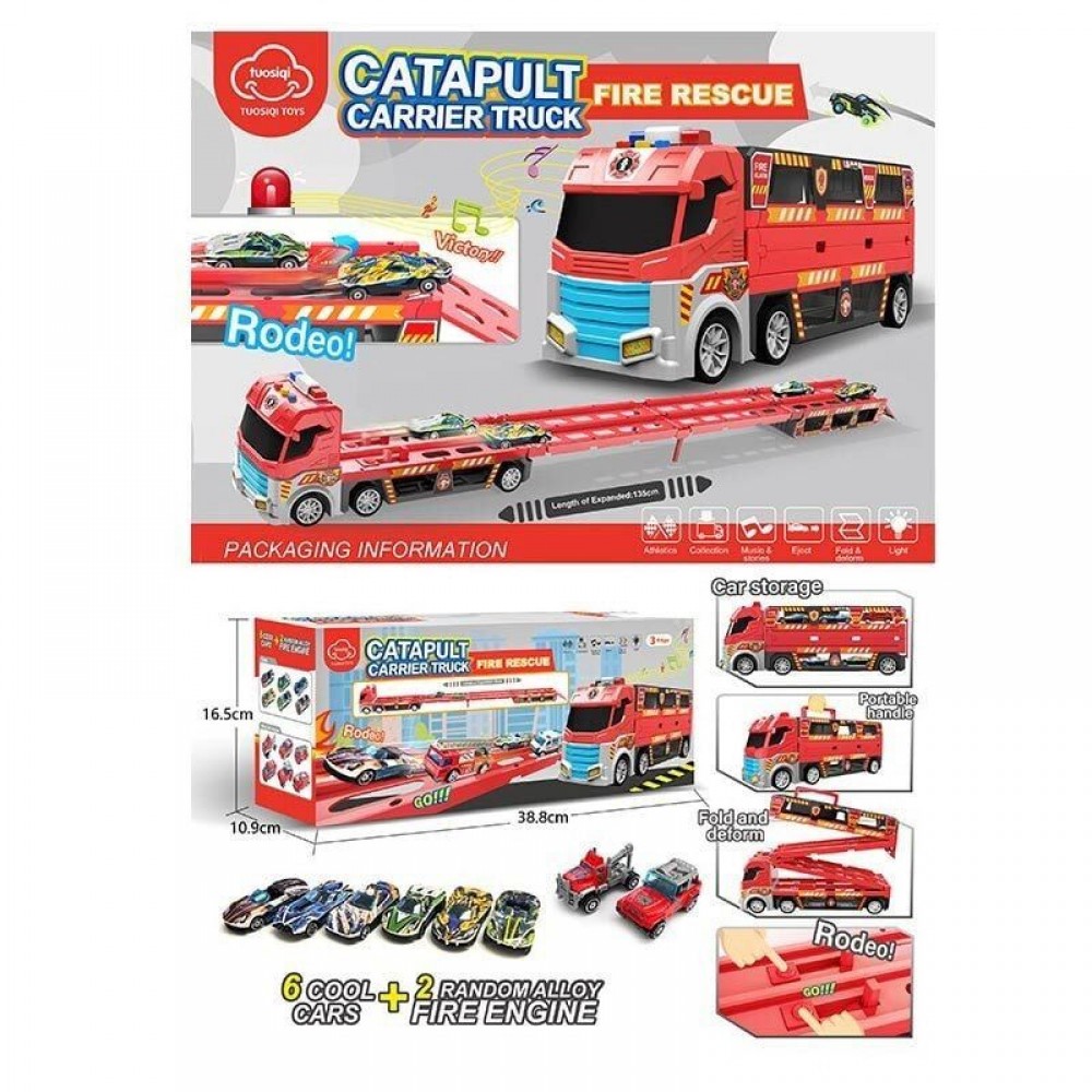 Интернет-магазин eToys предлагает вашему вниманию товар "Трейлер-трек "Пожарная машина", размер 38х10.5х15 см, длина трека 135 см, механический запускатель, подсветка, звук, 2 металлопластиковые модели, 6 пластиковых моделей, в коробке" по цене 881 грн..